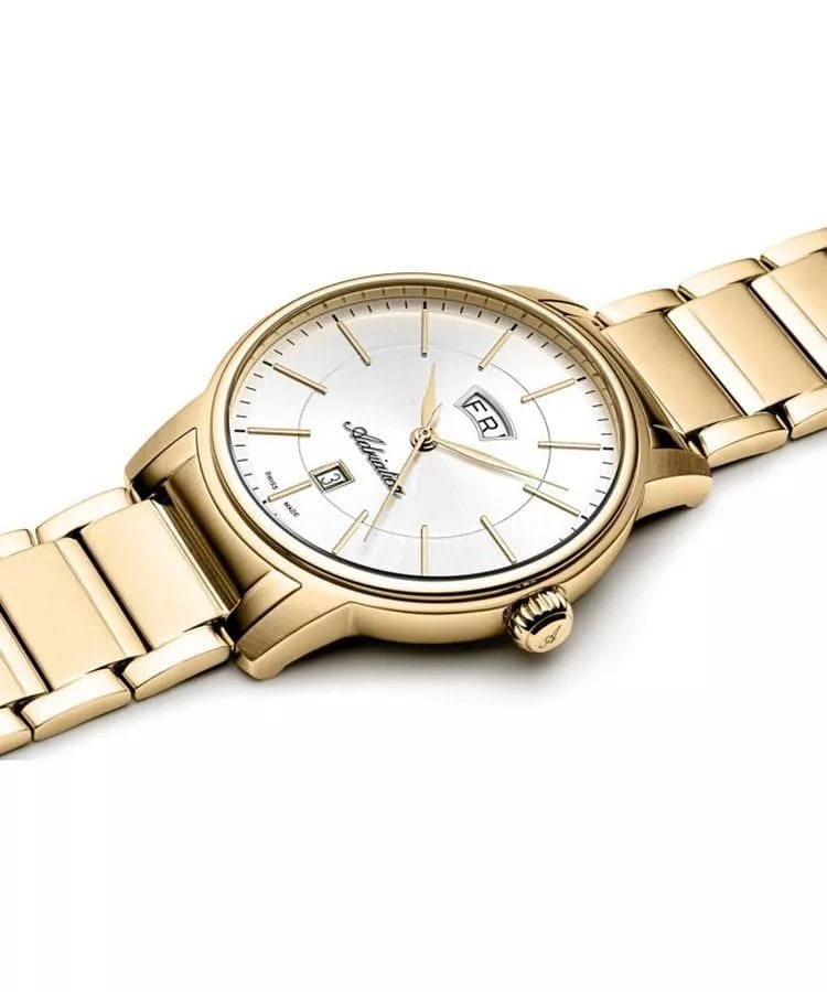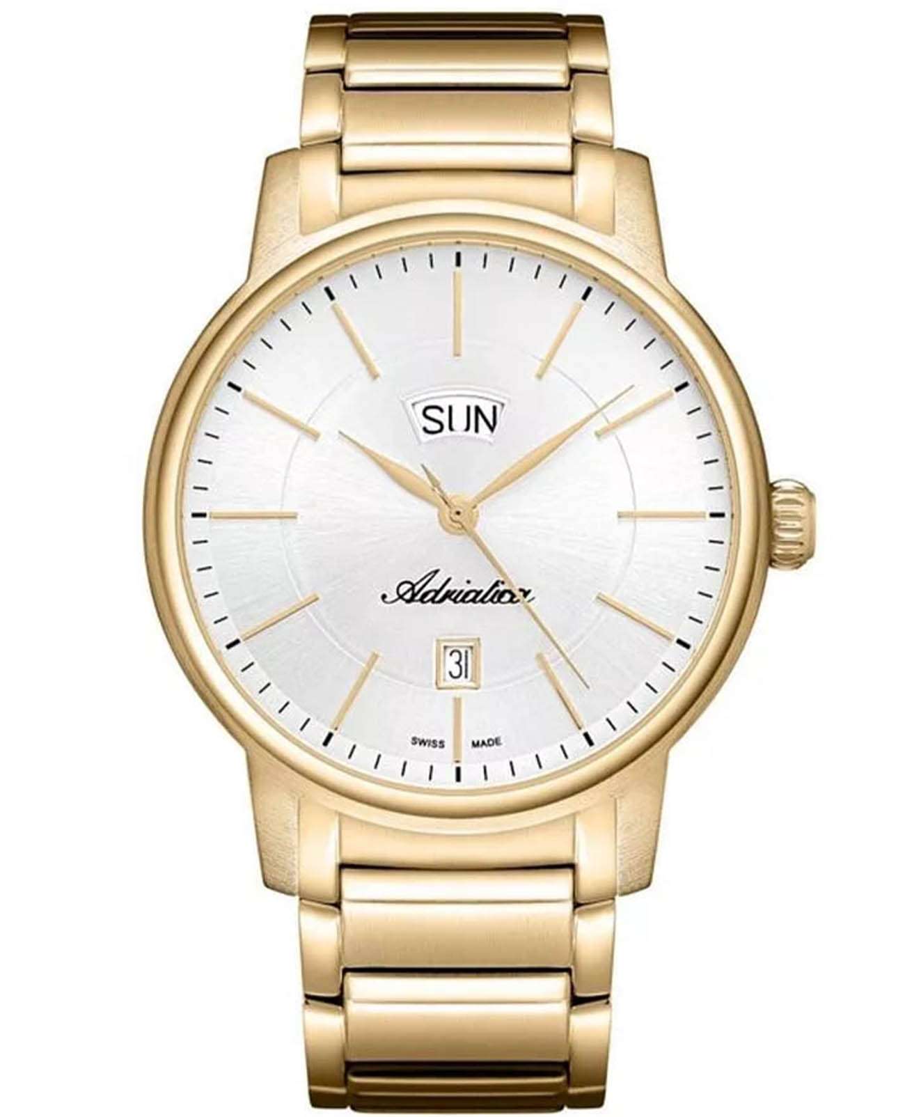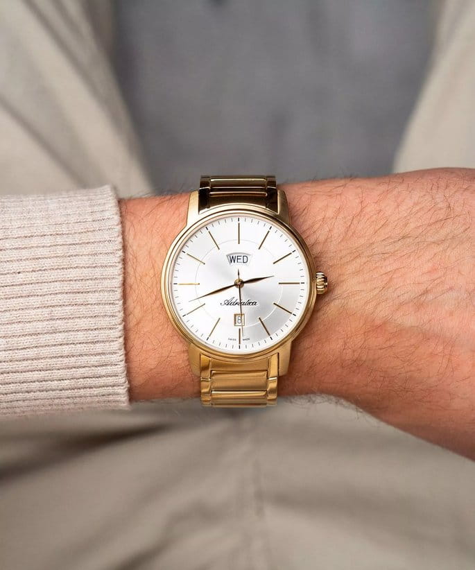 Часы Adriatica A1144.1113Q представляют собой идеальное сочетание элегантности и функциональности, разработанное для современных мужчин. Их стильный циферблат защищен сапфировым стекломСапфировое стеклоПрочный и надёжный материал из кристалла сапфира синтетического происхождения, характеризующийся особой твёрдостью и устойчивостью к царапинам и повреждениям., что придает дополнительную устойчивость к царапинам. Корпус из нержавеющей стали с PVD-покрытиемPVDУльтратонкое покрытие наносится в технике вакуумного напыления, сочетает в себе нитрид титана особой прочности со слоем золота или оксида хрома. Несёт в себе декоративную или защитную функцию. подчеркивает их изысканность и долговечность. Надежный кварцевый механизм с калибром RONDA 515 гарантирует точность времени, а водозащита WR 50 (5 ATM) обеспечивает защиту от воды в различных условиях. Браслет из нержавеющей стали с PVD-покрытиемPVDУльтратонкое покрытие наносится в технике вакуумного напыления, сочетает в себе нитрид титана особой прочности со слоем золота или оксида хрома. Несёт в себе декоративную или защитную функцию. на с раскладной застёжкойРаскладная застёжкаТакой тип застёжки используется только на браслетах из металла. Она никогда не раскрывается полностью, происходит разделение на 2 и более частей. Раскладывающая застёжка снизит вероятность потери часов к минимуму., гармонично дополняет общий дизайн и обеспечивает комфортное ношение на запястье. Окошко даты находится в положении 6 часов. День недели отображается в положении 12 часов. БезельБезельВнешний ободок, закрепляющий стекло. В спортивных часах так называется поворотное кольцо с делениями на циферблате, выполняет роль таймера – замеряет отрезки времени на шкале. Неподвижный безель – элемент декора. Однонаправленно вращающийся безель на дайверских часах позволяет фиксировать моменты погружения и выныривания на поверхность. с PVD-покрытиемPVDУльтратонкое покрытие наносится в технике вакуумного напыления, сочетает в себе нитрид титана особой прочности со слоем золота или оксида хрома. Несёт в себе декоративную или защитную функцию..