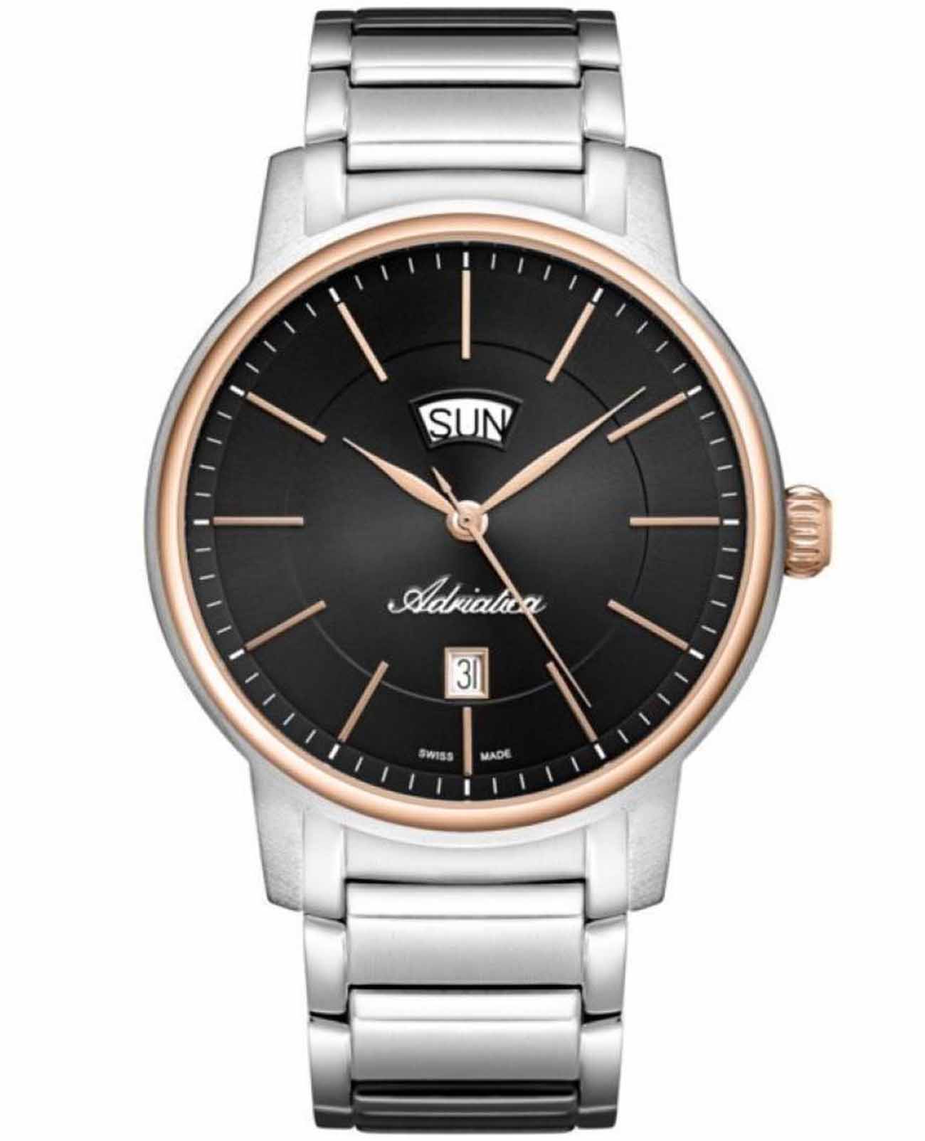 Часы Adriatica A1144.R114Q представляют собой идеальное сочетание элегантности и функциональности, разработанное для современных мужчин. Их стильный черный циферблат защищен сапфировым стекломСапфировое стеклоПрочный и надёжный материал из кристалла сапфира синтетического происхождения, характеризующийся особой твёрдостью и устойчивостью к царапинам и повреждениям., что придает дополнительную устойчивость к царапинам. Корпус из нержавеющей стали и безельБезельВнешний ободок, закрепляющий стекло. В спортивных часах так называется поворотное кольцо с делениями на циферблате, выполняет роль таймера – замеряет отрезки времени на шкале. Неподвижный безель – элемент декора. Однонаправленно вращающийся безель на дайверских часах позволяет фиксировать моменты погружения и выныривания на поверхность. с PVD-покрытиемPVDУльтратонкое покрытие наносится в технике вакуумного напыления, сочетает в себе нитрид титана особой прочности со слоем золота или оксида хрома. Несёт в себе декоративную или защитную функцию. подчеркивает их изысканность и долговечность. Надежный кварцевый механизм с калибром RONDA 515 гарантирует точность времени, а водозащита WR 50 (5 ATM) обеспечивает защиту от воды в различных условиях. Браслет из нержавеющей стали с раскладной застёжкойРаскладная застёжкаТакой тип застёжки используется только на браслетах из металла. Она никогда не раскрывается полностью, происходит разделение на 2 и более частей. Раскладывающая застёжка снизит вероятность потери часов к минимуму., гармонично дополняет общий дизайн и обеспечивает комфортное ношение на запястье. Окошко даты находится в положении 6 часов. День недели отображается в положении 12 часов.