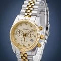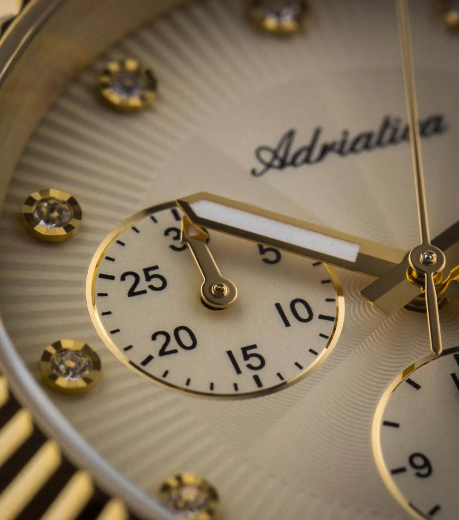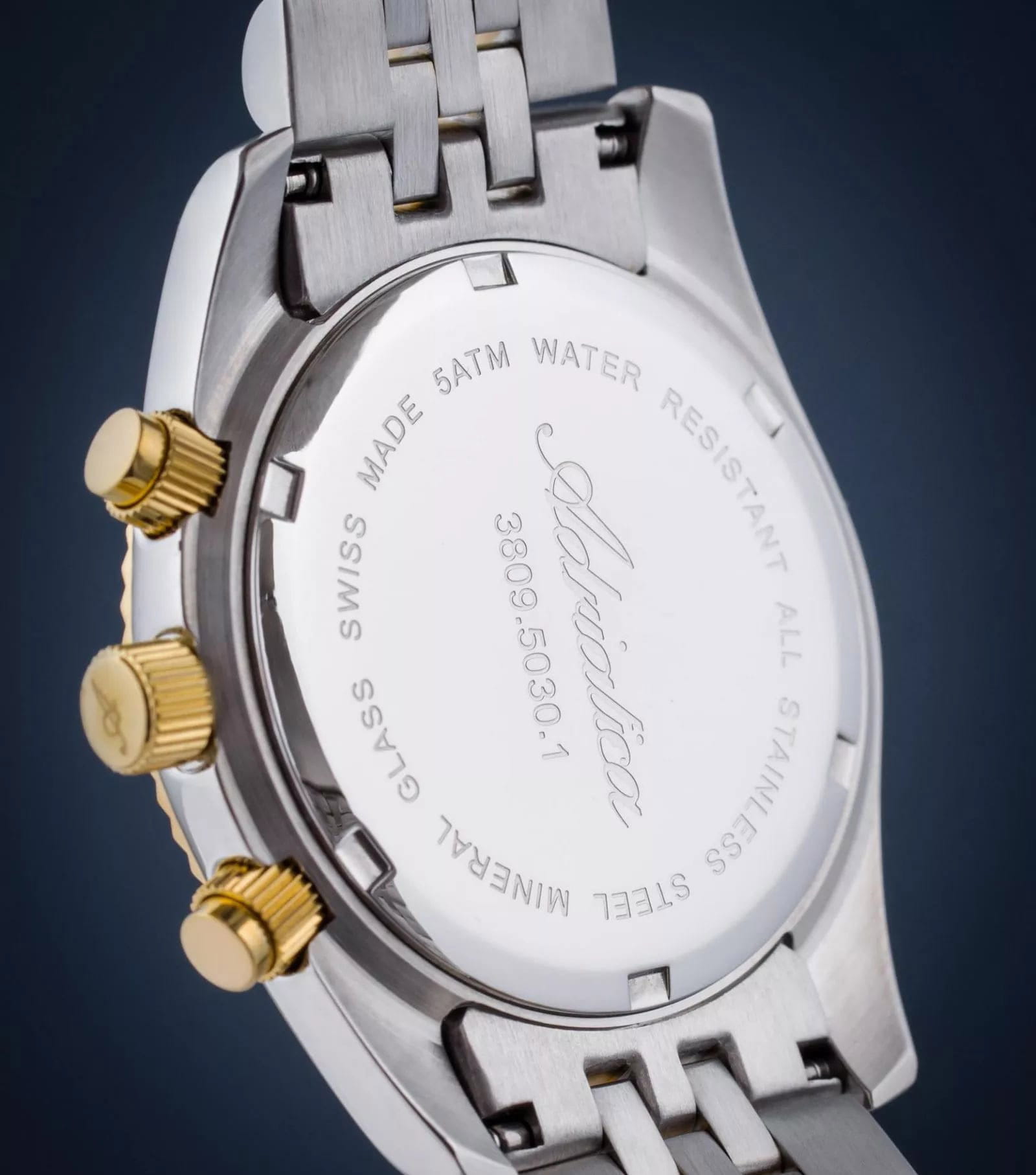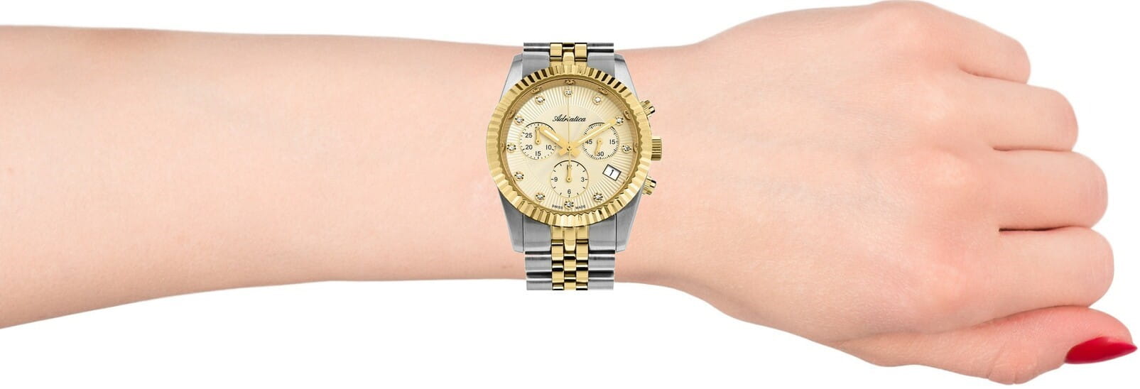 Швейцарские наручные часы-хронографХронографФункция позволяет измерять отрезки времени с особой точностью: часы, минуты, секунды. Верным признаком хронографа является наличие на циферблате 3 дополнительных окошек-счётчиков. с секундомеромСекундомерСекундоме́р — прибор, способный измерять интервалы времени с точностью до долей секунды. Adriatica A3809.2141CH, кварцевый механизм с высокой точностью. Минеральное стеклоМинеральное стеклоМинеральное стекло представляет собой искусственно выращенный минерал кварца. Такое стекло отличается особой устойчивостью к повреждениям и царапинам. Уступает по некоторым качествам сапфировому стеклу. устойчивое к мелким механическим повреждениям. Класс водозащиты: 50 метров, позволит защитить корпус от случайных брызг или капель дождя. Корпус часов изготовлен из стали. БезельБезельВнешний ободок, закрепляющий стекло. В спортивных часах так называется поворотное кольцо с делениями на циферблате, выполняет роль таймера – замеряет отрезки времени на шкале. Неподвижный безель – элемент декора. Однонаправленно вращающийся безель на дайверских часах позволяет фиксировать моменты погружения и выныривания на поверхность. с PVD-покрытиемPVDУльтратонкое покрытие наносится в технике вакуумного напыления, сочетает в себе нитрид титана особой прочности со слоем золота или оксида хрома. Несёт в себе декоративную или защитную функцию.. Стальной браслет на раскладной застёжкеРаскладная застёжкаТакой тип застёжки используется только на браслетах из металла. Она никогда не раскрывается полностью, происходит разделение на 2 и более частей. Раскладывающая застёжка снизит вероятность потери часов к минимуму. с PVD-покрытиемPVDУльтратонкое покрытие наносится в технике вакуумного напыления, сочетает в себе нитрид титана особой прочности со слоем золота или оксида хрома. Несёт в себе декоративную или защитную функцию.. Окошко даты находится в положении между 4 и 5 часов. Циферблат инкрустирован фианитами. Стрелки с люминесцентным покрытиемЛюминесцентное покрытиеПозволяет считывать показания времени в темноте. Производители наносят на стрелки, часовые индексы, безель или поверхность циферблата светонакопительный состав, дающий холодное свечение..