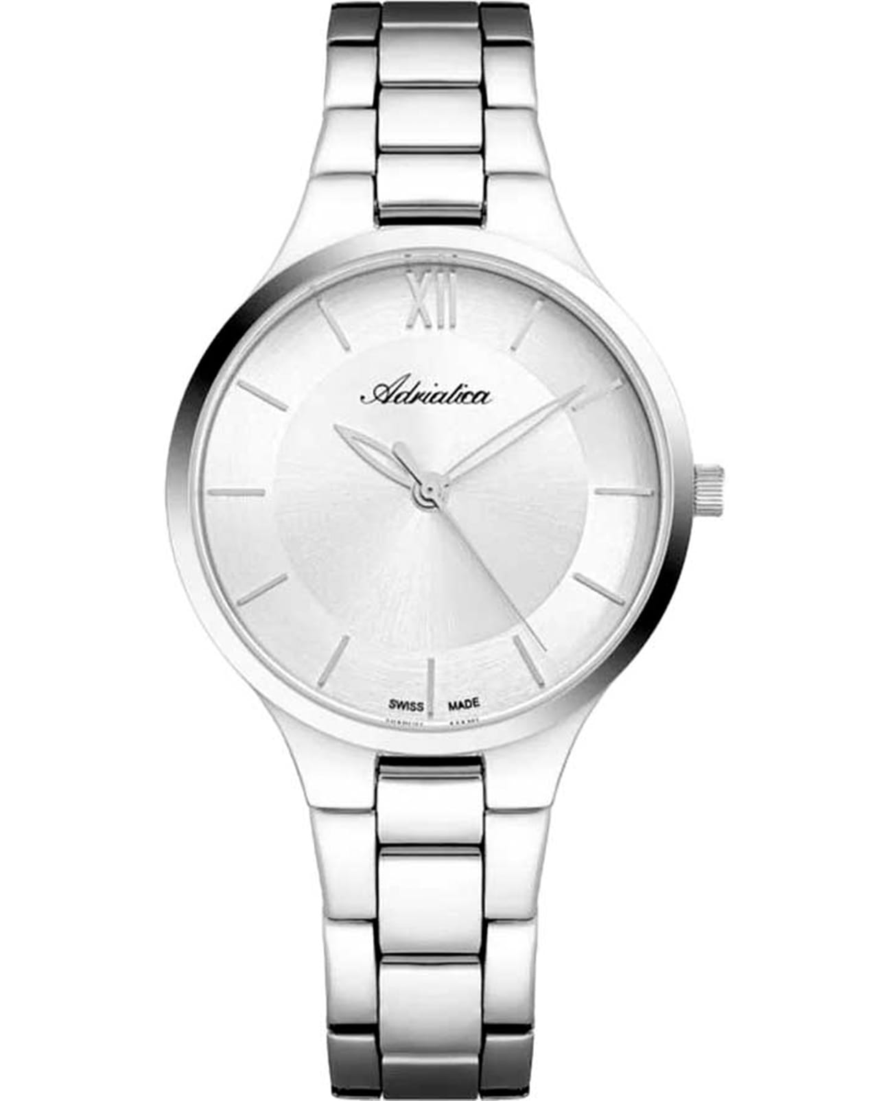 Женские кварцевые часы Adriatica A3823.5163Q — это элегантный аксессуар швейцарского производства с корпусом круглой формы из нержавеющей стали. Циферблат серебристого цвета выполнен по технологии Sunray с эффектом «солнечных лучей» и оформлен штрихами, а также римской цифрой 12. Защиту обеспечивает минеральное стеклоМинеральное стеклоМинеральное стекло представляет собой искусственно выращенный минерал кварца. Такое стекло отличается особой устойчивостью к повреждениям и царапинам. Уступает по некоторым качествам сапфировому стеклу.. Часы оснащены центральной секундной стрелкой. Браслет из нержавеющей стали фиксируется на раскладной застёжкеРаскладная застёжкаТакой тип застёжки используется только на браслетах из металла. Она никогда не раскрывается полностью, происходит разделение на 2 и более частей. Раскладывающая застёжка снизит вероятность потери часов к минимуму.. Механизм — кварцевый калибр Ronda 783. Водонепроницаемость 30 метров, позволит защитить корпус от случайных брызг или капель дождя.