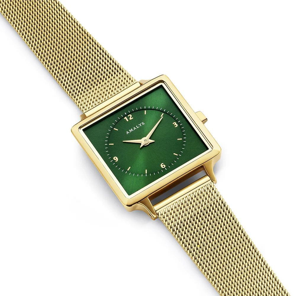 Amalys AMW-136 — женская модель с утончённой минималистичной эстетикой, где квадратный корпус с PVD-покрытиемPVDУльтратонкое покрытие наносится в технике вакуумного напыления, сочетает в себе нитрид титана особой прочности со слоем золота или оксида хрома. Несёт в себе декоративную или защитную функцию. размером 25 мм подчёркивает современный характер и чистоту линий. Механизм — точный кварцевый, обеспечивающий стабильный ход и надёжность в повседневном использовании. Поверхность циферблата оформлена в лаконичном стиле с тонкими метками и стрелками, создающими гармонию и визуальную лёгкость. Защитную функцию выполняет минеральное стеклоМинеральное стеклоМинеральное стекло представляет собой искусственно выращенный минерал кварца. Такое стекло отличается особой устойчивостью к повреждениям и царапинам. Уступает по некоторым качествам сапфировому стеклу., устойчивое к механическим воздействиям и сохраняющее читаемость при ежедневной носке. Браслет с PVD-покрытиемPVDУльтратонкое покрытие наносится в технике вакуумного напыления, сочетает в себе нитрид титана особой прочности со слоем золота или оксида хрома. Несёт в себе декоративную или защитную функцию. выполнен в виде «миланской сетки» шириной 14 мм, оснащён раскладным замкомРаскладной замокДанный вариант застежки используется только на часах с металлическим браслетом. Отличительная особенность такого крепления в том, что длина браслета становится универсальной и вы можете самостоятельно отрегулировать нужный вам размер – застежка просто двигается по браслету часов., его гибкая структура обеспечивает комфортное прилегание к запястью и визуальную утончённость. Единство корпуса и браслета создаёт целостный образ, а изысканная простота дизайна делает модель универсальной — она одинаково уместна и в деловой обстановке, и в повседневных сочетаниях.