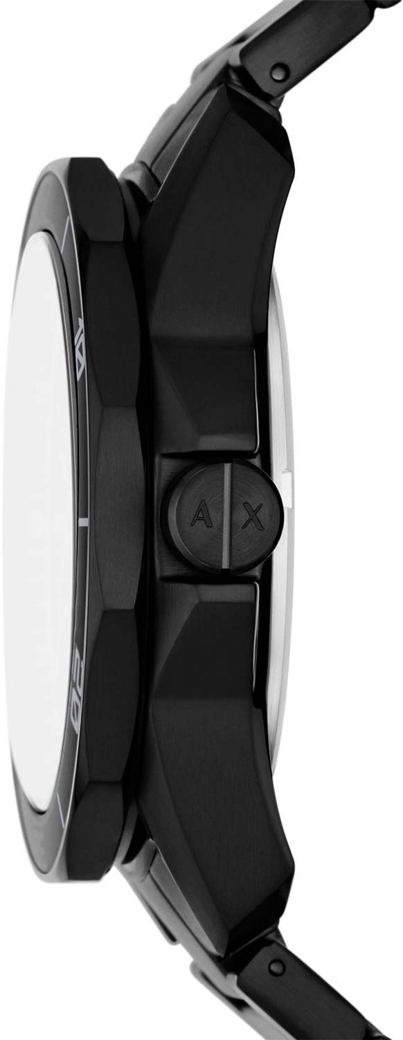 Мужские наручные часы с минеральным стекломМинеральное стеклоМинеральное стекло представляет собой искусственно выращенный минерал кварца. Такое стекло отличается особой устойчивостью к повреждениям и царапинам. Уступает по некоторым качествам сапфировому стеклу. Armani Exchange Dante AX1952, кварцевый механизм с высокой точностью. Класс водозащиты: 100 метров, позволит плавать, нырять и заниматься другими водными видами спорта. Корпус часов изготовлен из стали с IP-покрытиемIP-покрытиеМетод ионного напыления. Демонстрирует повышенную устойчивость к истиранию, окислению и химическим веществам. Под воздействием высокого давления и температуры около 1500°C молекулы металла надёжно соединяются с частицами корпуса часов.. Стальной браслет с IP-покрытиемIP-покрытиеМетод ионного напыления. Демонстрирует повышенную устойчивость к истиранию, окислению и химическим веществам. Под воздействием высокого давления и температуры около 1500°C молекулы металла надёжно соединяются с частицами корпуса часов. на раскладной застёжкеРаскладная застёжкаТакой тип застёжки используется только на браслетах из металла. Она никогда не раскрывается полностью, происходит разделение на 2 и более частей. Раскладывающая застёжка снизит вероятность потери часов к минимуму.. Вращающийся  безельБезельВнешний ободок, закрепляющий стекло. В спортивных часах так называется поворотное кольцо с делениями на циферблате, выполняет роль таймера – замеряет отрезки времени на шкале. Неподвижный безель – элемент декора. Однонаправленно вращающийся безель на дайверских часах позволяет фиксировать моменты погружения и выныривания на поверхность. с IP-покрытиемIP-покрытиеМетод ионного напыления. Демонстрирует повышенную устойчивость к истиранию, окислению и химическим веществам. Под воздействием высокого давления и температуры около 1500°C молекулы металла надёжно соединяются с частицами корпуса часов.. Текстурированный циферблат с метками в виде штрихов. Окошко даты находится в положении 6 часов.
