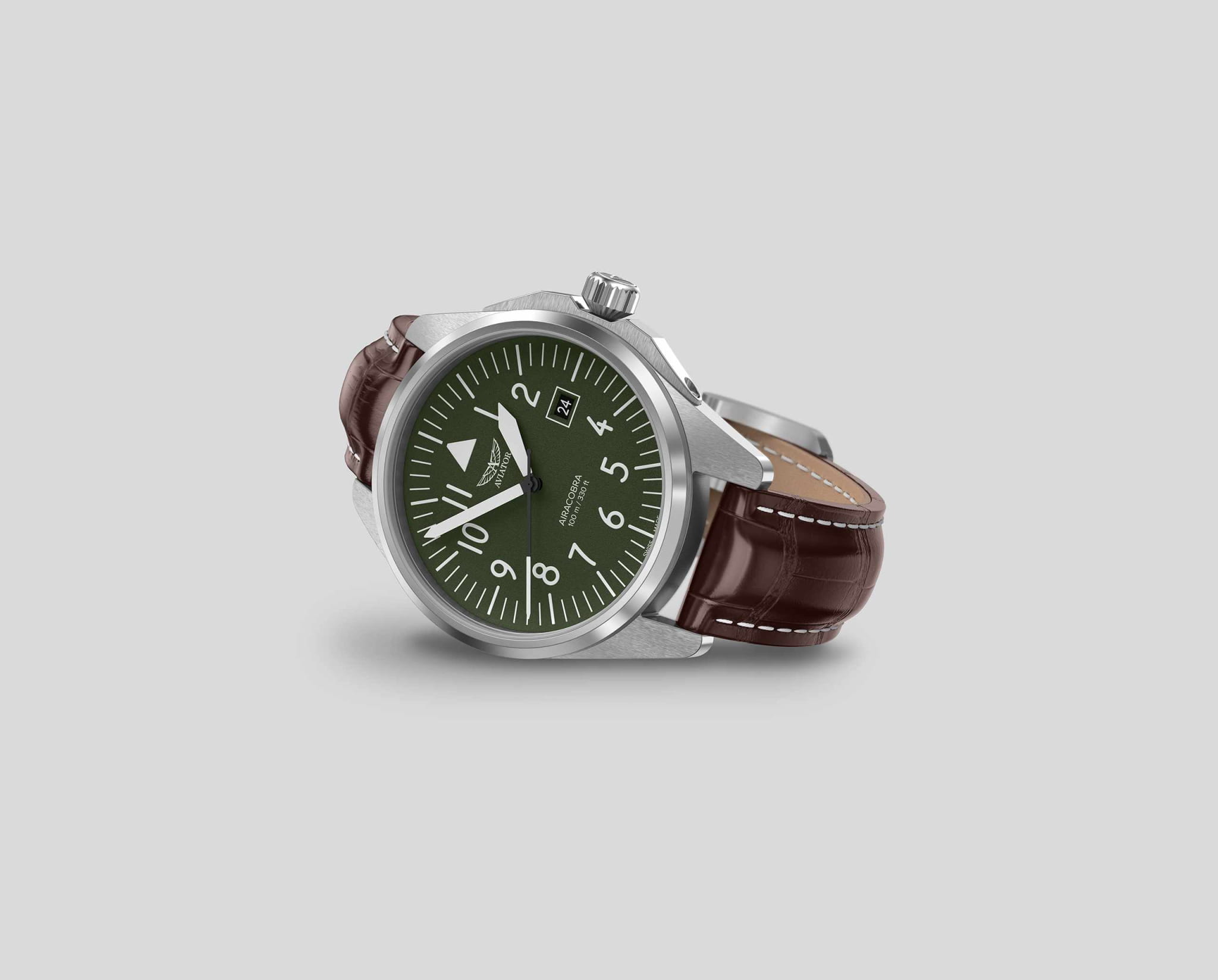 Aviator V.1.38.0.319.4 “Airacobra 43 Type A” — надёжные швейцарские пилотские часы с насыщенным функционалом и строгим авиационным дизайном. Корпус диаметром 42,8 мм выполнен из нержавеющей стали.