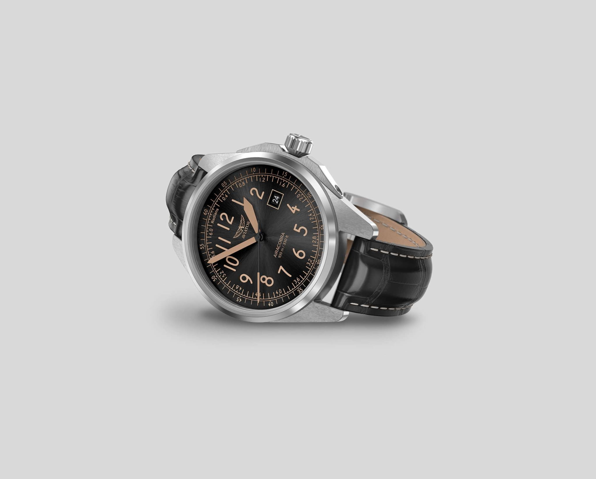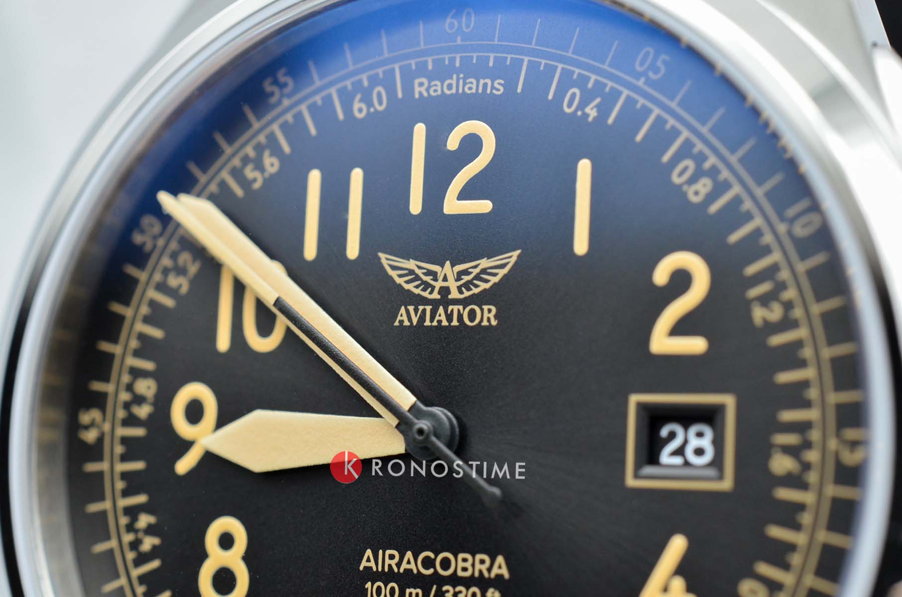 Aviator V.1.38.0.323.4 “Airacobra 43 Type A” — надёжные швейцарские пилотские часы с насыщенным функционалом и строгим авиационным дизайном. Корпус диаметром 42,8 мм выполнен из нержавеющей стали.
