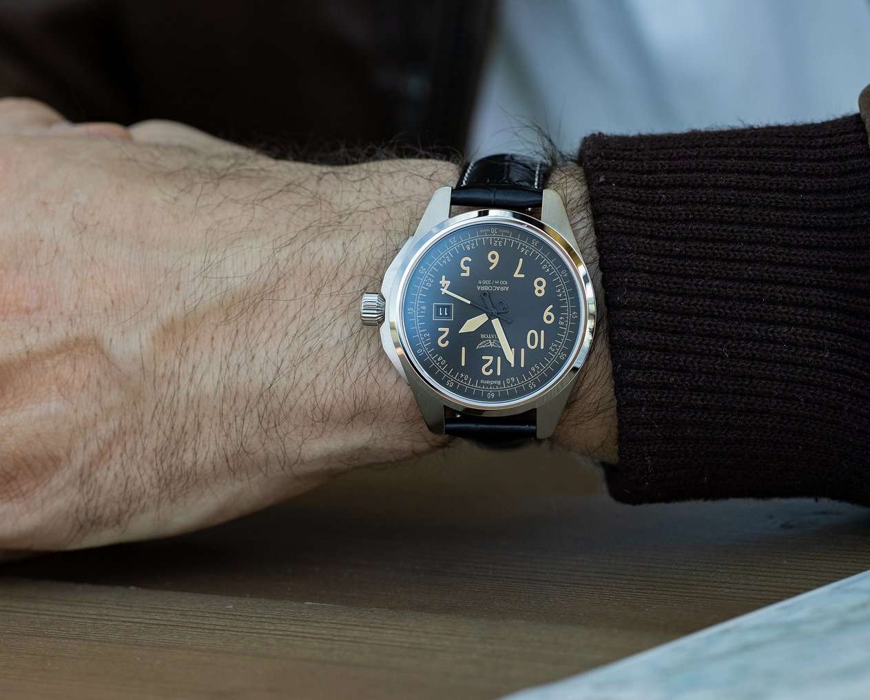 Циферблат в стиле Type A имеет крупные арабские цифры и жёсткий контраст, соответствующий классическим пилотским образцам. Обе стрелки и метки покрыты люминесцентным покрытиемЛюминесцентное покрытиеПозволяет считывать показания времени в темноте. Производители наносят на стрелки, часовые индексы, безель или поверхность циферблата светонакопительный состав, дающий холодное свечение. — это обеспечивает отличную читаемость в любых условиях. Окошко даты расположено у отметки «3 часа».