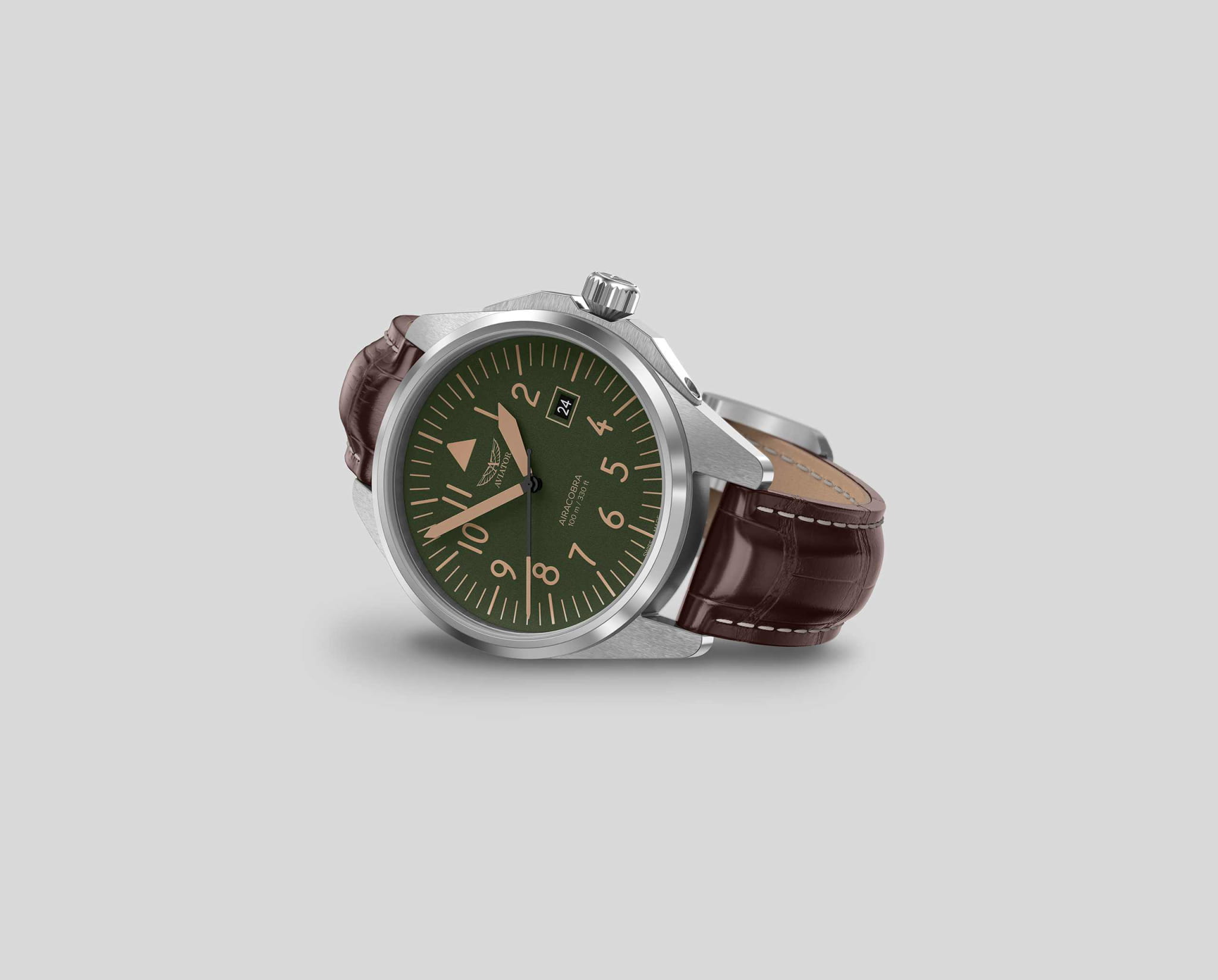 Aviator V.1.38.0.330.4 “Airacobra 43 Type A” — надёжные швейцарские пилотские часы с насыщенным функционалом и строгим авиационным дизайном. Корпус диаметром 42,8 мм выполнен из нержавеющей стали.
