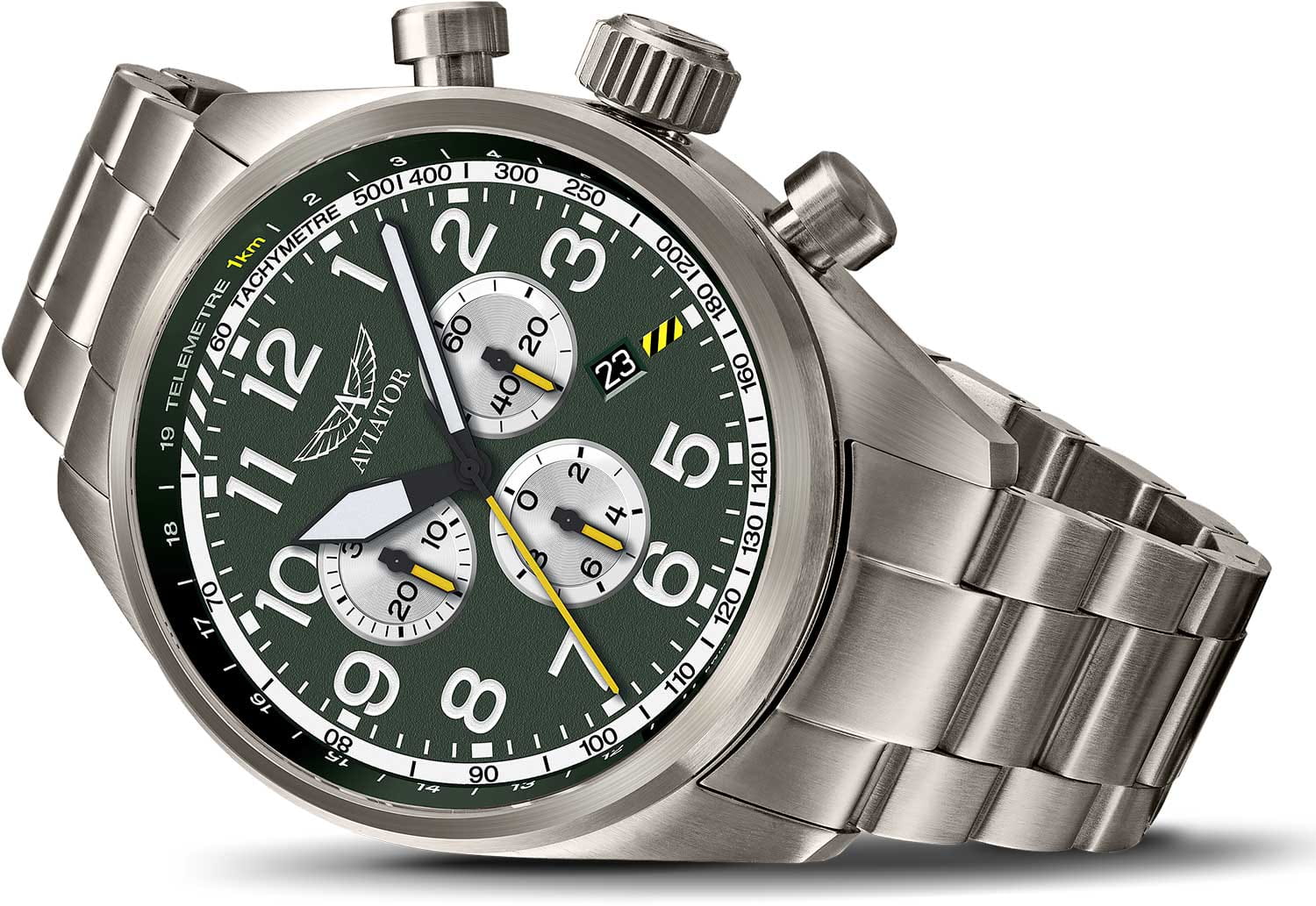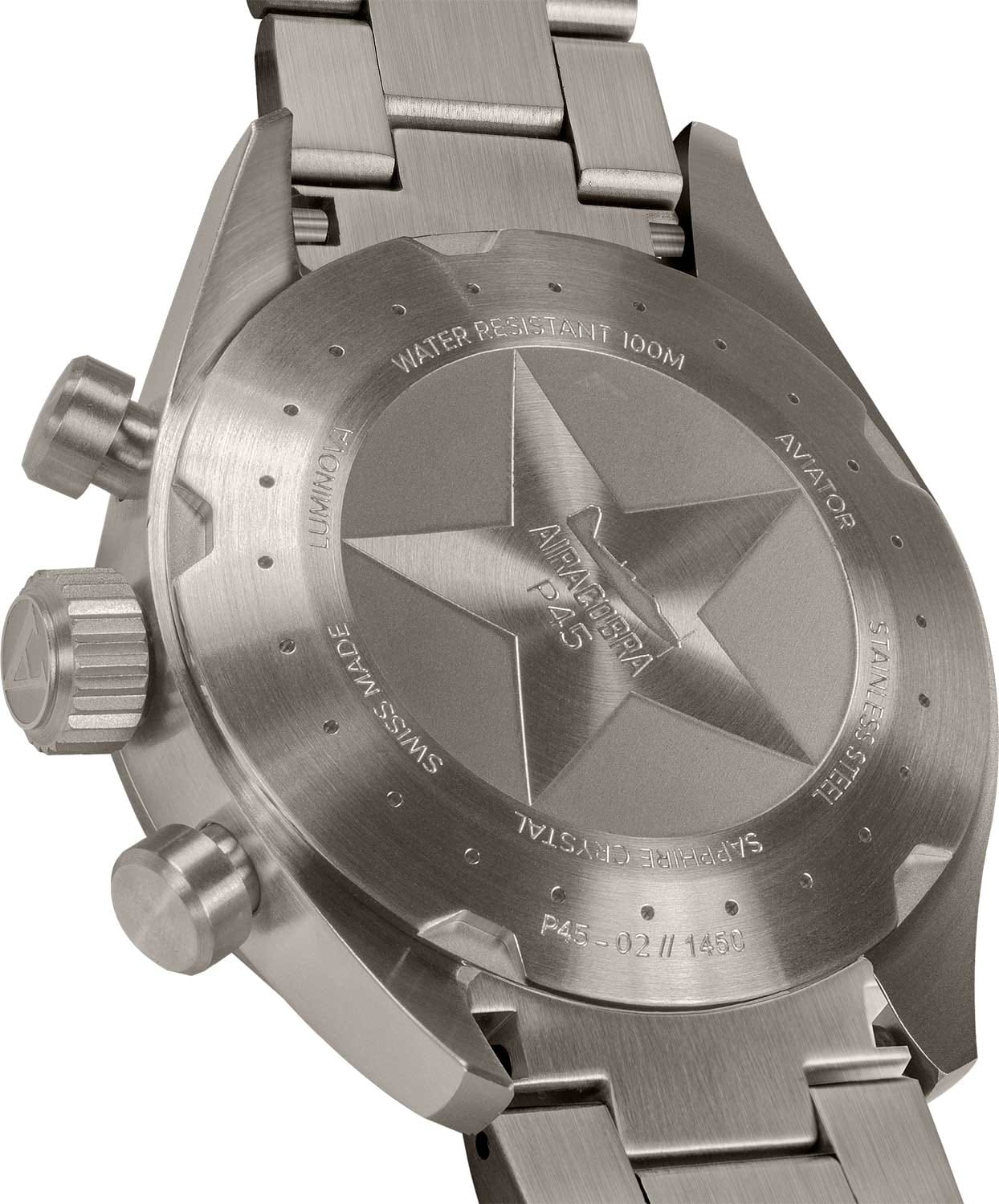 Aviator Airacobra P45 Chrono V.2.25.7.171.5 — швейцарские часы в духе пилотских инструментов, объединяющий точность, удобство и лаконичный дизайн. Диаметр корпуса — 45 мм, выполнен из нержавеющей стали 316L с PVD-покрытиемPVDУльтратонкое покрытие наносится в технике вакуумного напыления, сочетает в себе нитрид титана особой прочности со слоем золота или оксида хрома. Несёт в себе декоративную или защитную функцию. титанового цвета, что подчёркивает техническую надёжность в образе часов. Циферблат оформлен в классическом aviator-стиле: крупные арабские цифры, широкие стрелки и чёткое деление минут позволяют считывать время мгновенно. Стрелки и метки покрыты люминесцентным покрытиемЛюминесцентное покрытиеПозволяет считывать показания времени в темноте. Производители наносят на стрелки, часовые индексы, безель или поверхность циферблата светонакопительный состав, дающий холодное свечение. Superluminova для отличной читаемости при слабом освещении. Циферблат защищён стойким сапфировым стекломСапфировое стеклоПрочный и надёжный материал из кристалла сапфира синтетического происхождения, характеризующийся особой твёрдостью и устойчивостью к царапинам и повреждениям. с антибликовым покрытиемАнтибликовое покрытиеСлой оксида металла в 0,13-0,3 микрон, благодаря которому стекло часов не бликует и не отражает свет. Антибликовое покрытие уменьшает отражение света в 10 раз, обеспечивая отличную читаемость показателей циферблата.. У модели присутствуют дата и точный откидной механизм завинчивающейся заводной головки и задней крышки, обеспечивающий надёжную водозащиту до 100 м и защиту от ударов. Внутри установлен швейцарский кварцевый механизм, который обеспечивает функции хронографаХронографФункция позволяет измерять отрезки времени с особой точностью: часы, минуты, секунды. Верным признаком хронографа является наличие на циферблате 3 дополнительных окошек-счётчиков.. Функции добавить (ADD) и разделить (SPLIT). Часы комплектуются браслетом из нержавеющей стали с PVD-покрытиемPVDУльтратонкое покрытие наносится в технике вакуумного напыления, сочетает в себе нитрид титана особой прочности со слоем золота или оксида хрома. Несёт в себе декоративную или защитную функцию. титанового цвета с удобной раскладной застёжкойРаскладная застёжкаТакой тип застёжки используется только на браслетах из металла. Она никогда не раскрывается полностью, происходит разделение на 2 и более частей. Раскладывающая застёжка снизит вероятность потери часов к минимуму., обеспечивающей надёжную фиксацию и комфорт при ежедневной носке. Эти изысканные часы так же обладают функциями тахиметраТахиметрРазмеченная шкала, располагается на ободке или безеле часов. Тахиметр позволяет рассчитать скорость на определённом участке пути, расстояние измеряется в километрах или милях., секундомераСекундомерСекундоме́р — прибор, способный измерять интервалы времени с точностью до долей секунды. и телеметра. Airacobra — это практичный и стильный инструмент для путешествий и активной повседневности, объединяющий авиационную эстетику, точный механизм и удобство.