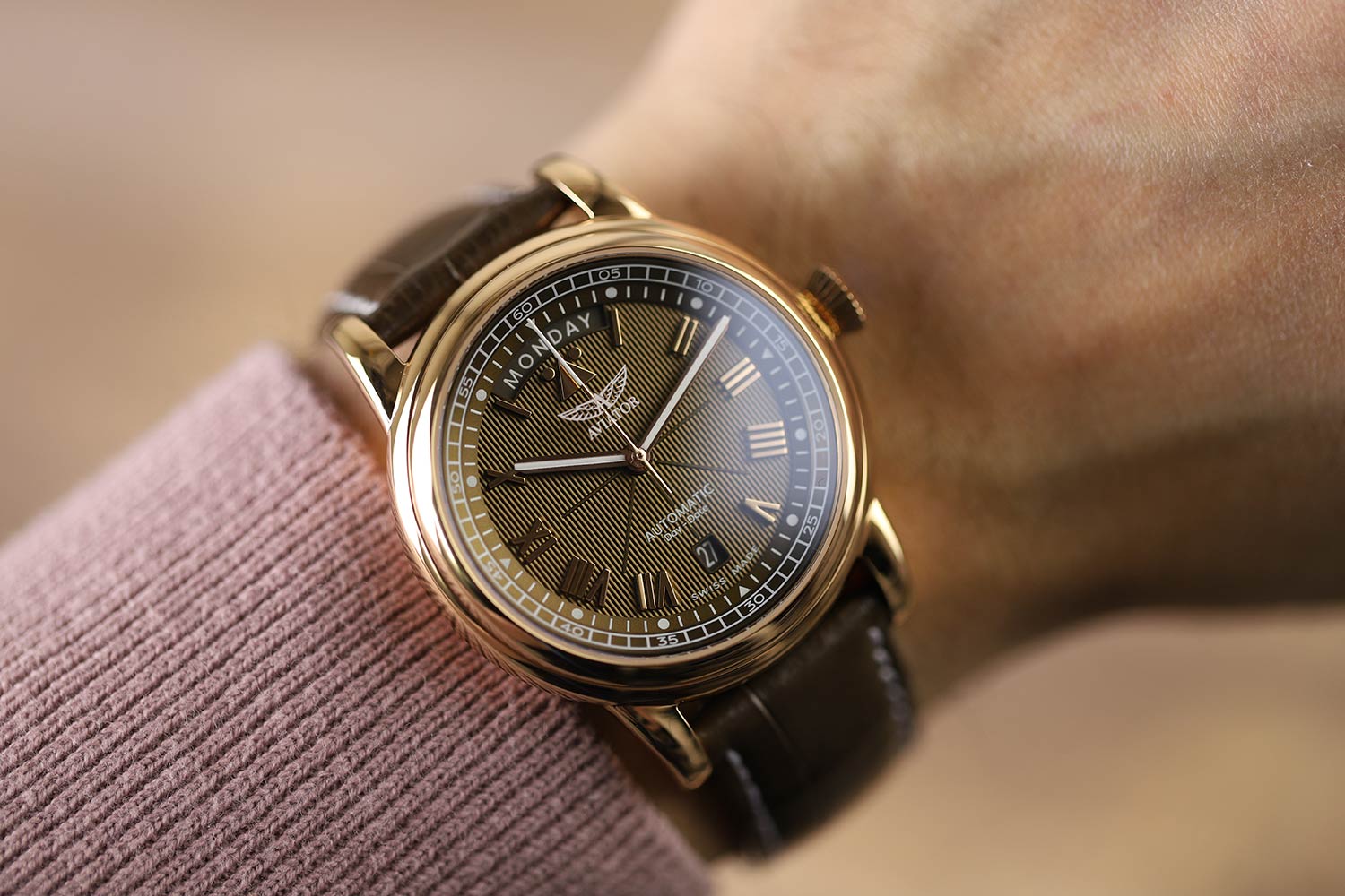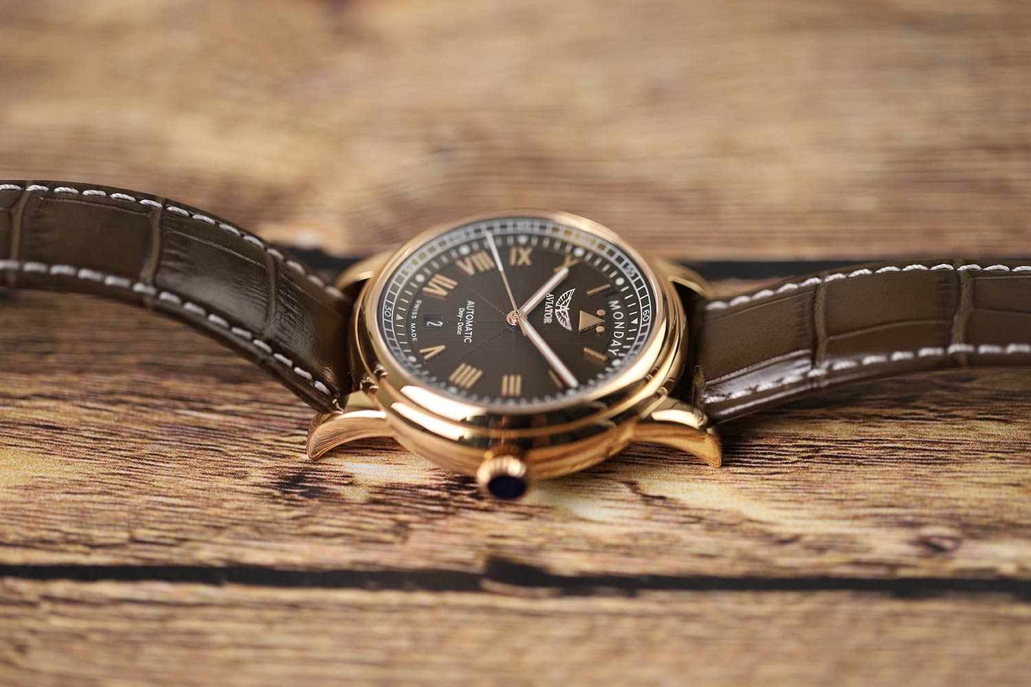 Aviator Douglas Day Date V.3.35.2.280.4 — швейцарские часы в классике авиадизайна, сочетающие безупречную читаемость и высокую надёжность. Лимитированная серия. Корпус диаметром 41,2 мм выполнен из нержавеющей стали 316L с PVD-покрытиемPVDУльтратонкое покрытие наносится в технике вакуумного напыления, сочетает в себе нитрид титана особой прочности со слоем золота или оксида хрома. Несёт в себе декоративную или защитную функцию. цвета розового золота. Накладные метки выполнены в виде римских цифр. Окошко даты находится в положении 6 часов. День недели находится в положении 12 часов. Часовые метки и стрелки покрыты люминесцентным покрытиемЛюминесцентное покрытиеПозволяет считывать показания времени в темноте. Производители наносят на стрелки, часовые индексы, безель или поверхность циферблата светонакопительный состав, дающий холодное свечение. Superluminova, позволяющим легко определять время даже в тёмное время суток. Поверхность защищена прочным сапфировым стекломСапфировое стеклоПрочный и надёжный материал из кристалла сапфира синтетического происхождения, характеризующийся особой твёрдостью и устойчивостью к царапинам и повреждениям. с антибликовым покрытием, устойчивым к царапинам. Сердце модели — швейцарский механизм Sellita SW 240-2, известный своей точностью и долговечностью. Водозащита 100 метров, позволит плавать, нырять и заниматься другими водными видами спорта. Завинчивающаяся головка и задняя крышка обеспечивают уверенную ударопрочностьУдаропрочный корпусМеханизм заключён в корпус, выполненный из современных материалов, устойчивых к ударам, механическим повреждениям и падению с высоты: инновационный пластик, карбон, нержавеющая сталь, титан. и надёжную защиту от влаги и пыли. В механизме 26 камней, запас хода до 41 час. Модель дополнена кожаным ремешком с выразительной текстурой и классическим стилем, закреплённым с помощью застёжке-бабочке с кнопкамиЗастёжка "бабочка"Такой вид застёжки дополняется предохранителями, помогающими избежать случайного раскрытия браслета. Обладают изящным исполнением. — для максимального комфорта и лёгкости в повседневном использовании. Модель вдохновлена американским пассажирским самолетом Douglas DC-3, который является одним из лучших самолетов за всю историю авиации. Aviator — это образец лётной точности, инженерной чёткости и сдержанной роскоши, идеально подходящий для тех, кто ценит функциональность и уверенность в каждом элементе.
