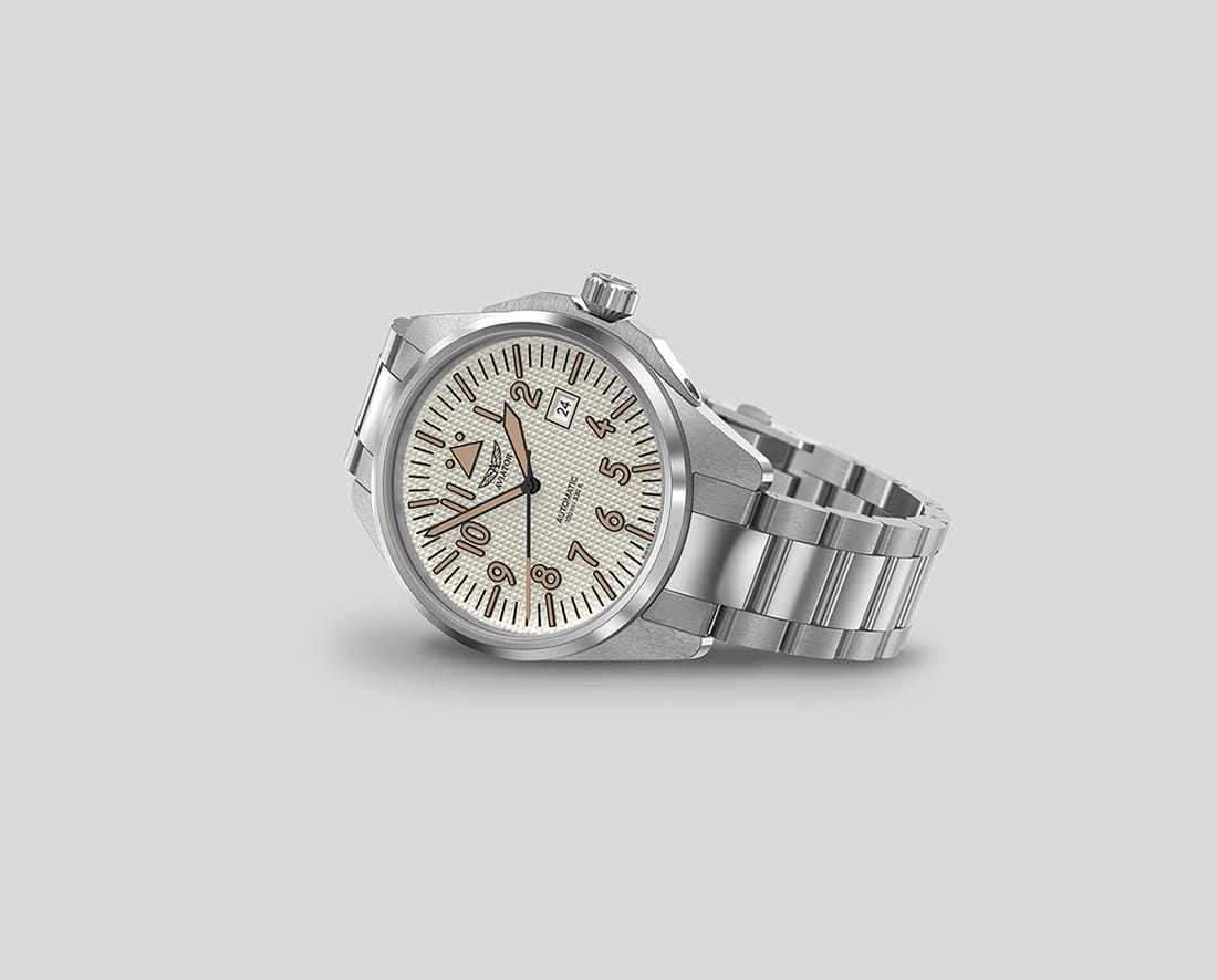 Aviator Airacobra 43 Auto V.3.39.0.336.5 — швейцарские часы в классике авиадизайна, сочетающие безупречную читаемость и высокую надёжность. Корпус диаметром 42,8 мм выполнен из нержавеющей стали 316L. Матовый циферблат с крупными арабскими цифрами, широкими стрелками и контрастной шкалой минут обеспечивает точную и быструю считываемость информации — как и положено настоящим пилотским часам. У отметки «3 часа» — окошко даты. Часовые метки и стрелки покрыты люминесцентным покрытиемЛюминесцентное покрытиеПозволяет считывать показания времени в темноте. Производители наносят на стрелки, часовые индексы, безель или поверхность циферблата светонакопительный состав, дающий холодное свечение. Superluminova, позволяющим легко определять время даже в тёмное время суток. Поверхность защищена прочным сапфировым стекломСапфировое стеклоПрочный и надёжный материал из кристалла сапфира синтетического происхождения, характеризующийся особой твёрдостью и устойчивостью к царапинам и повреждениям. с антибликовым покрытиемАнтибликовое покрытиеСлой оксида металла в 0,13-0,3 микрон, благодаря которому стекло часов не бликует и не отражает свет. Антибликовое покрытие уменьшает отражение света в 10 раз, обеспечивая отличную читаемость показателей циферблата., устойчивым к царапинам. Сердце модели — швейцарский механизм Sellita SW 200-1, известный своей точностью и долговечностью. Водозащита 100 метров, позволит плавать, нырять и заниматься другими водными видами спорта. Завинчивающаяся головка и задняя крышка обеспечивают уверенную ударопрочностьУдаропрочный корпусМеханизм заключён в корпус, выполненный из современных материалов, устойчивых к ударам, механическим повреждениям и падению с высоты: инновационный пластик, карбон, нержавеющая сталь, титан. и надёжную защиту от влаги и пыли. В механизме 26 камней, запас хода до 38 часов. Модель дополнена стальным браслетом на раскладной застёжкеРаскладная застёжкаТакой тип застёжки используется только на браслетах из металла. Она никогда не раскрывается полностью, происходит разделение на 2 и более частей. Раскладывающая застёжка снизит вероятность потери часов к минимуму. — для максимального комфорта и лёгкости в повседневном использовании. Aviator — это образец лётной точности, инженерной чёткости и сдержанной роскоши, идеально подходящий для тех, кто ценит функциональность и уверенность в каждом элементе.  Лимитированная серия.