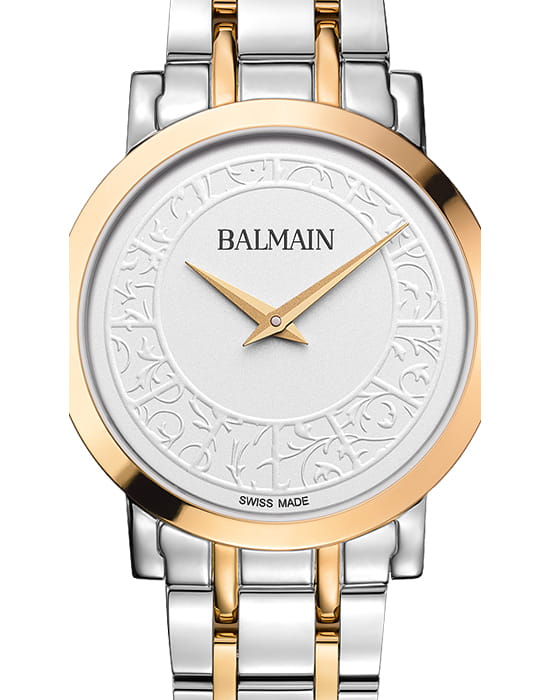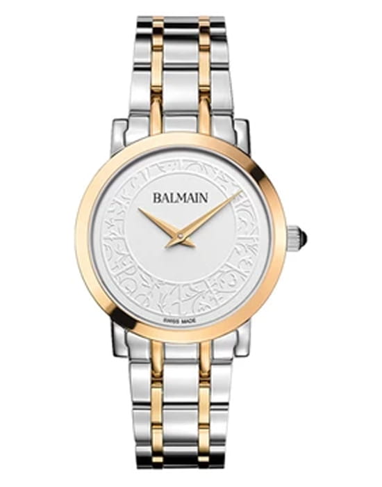 Женские часы Balmain Laelia B4432.39.15 кварцевый механизм с высокой точностью. Сапфировое стеклоСапфировое стеклоПрочный и надёжный материал из кристалла сапфира синтетического происхождения, характеризующийся особой твёрдостью и устойчивостью к царапинам и повреждениям. устойчивое к появлению царапин, обладающее высокой прозрачностью. Корпус изготовлен из нержавеющей стали PVD-покрытиемPVDУльтратонкое покрытие наносится в технике вакуумного напыления, сочетает в себе нитрид титана особой прочности со слоем золота или оксида хрома. Несёт в себе декоративную или защитную функцию.. Класс водозащиты: 50 метров, позволит защитить корпус от случайных брызг или капель дождя. Стальной браслет с PVD-покрытиемPVDУльтратонкое покрытие наносится в технике вакуумного напыления, сочетает в себе нитрид титана особой прочности со слоем золота или оксида хрома. Несёт в себе декоративную или защитную функцию.. на застёжке «бабочка» с кнопкамиЗастёжка "бабочка"Такой вид застёжки дополняется предохранителями, помогающими избежать случайного раскрытия браслета. Обладают изящным исполнением. . БезельБезельВнешний ободок, закрепляющий стекло. В спортивных часах так называется поворотное кольцо с делениями на циферблате, выполняет роль таймера – замеряет отрезки времени на шкале. Неподвижный безель – элемент декора. Однонаправленно вращающийся безель на дайверских часах позволяет фиксировать моменты погружения и выныривания на поверхность. с PVD-покрытиемPVDУльтратонкое покрытие наносится в технике вакуумного напыления, сочетает в себе нитрид титана особой прочности со слоем золота или оксида хрома. Несёт в себе декоративную или защитную функцию..