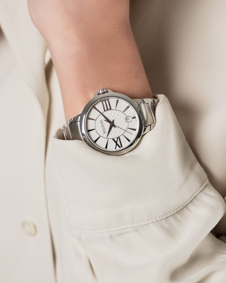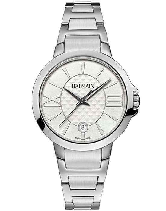 Женские часы Balmain Tilia B4571.33.22 кварцевый механизм с высокой точностью. Сапфировое стеклоСапфировое стеклоПрочный и надёжный материал из кристалла сапфира синтетического происхождения, характеризующийся особой твёрдостью и устойчивостью к царапинам и повреждениям. устойчивое к появлению царапин, обладающее высокой прозрачностью. Корпус изготовлен из нержавеющей стали. Класс водозащиты: 30 метров, позволит защитить корпус от случайных брызг или капель дождя. Стальной браслет на застёжке «бабочка» с кнопкамиЗастёжка "бабочка"Такой вид застёжки дополняется предохранителями, помогающими избежать случайного раскрытия браслета. Обладают изящным исполнением. . Окошко даты находится в положении 6 часов.