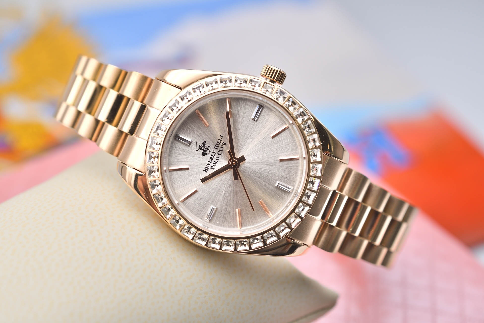 Американские женские часы с минеральным стекломМинеральное стеклоМинеральное стекло представляет собой искусственно выращенный минерал кварца. Такое стекло отличается особой устойчивостью к повреждениям и царапинам. Уступает по некоторым качествам сапфировому стеклу. Beverly Hills Polo Club BP3171C.430, с кварцевым механизмом с высокой точностью. Класс водозащиты: 30 метров, позволит защитить корпус от случайных брызг или капель дождя. БезельБезельВнешний ободок, закрепляющий стекло. В спортивных часах так называется поворотное кольцо с делениями на циферблате, выполняет роль таймера – замеряет отрезки времени на шкале. Неподвижный безель – элемент декора. Однонаправленно вращающийся безель на дайверских часах позволяет фиксировать моменты погружения и выныривания на поверхность. украшен кристаллами. Корпус часов изготовлен из суперметалла с IP-покрытиемIP-покрытиеМетод ионного напыления. Демонстрирует повышенную устойчивость к истиранию, окислению и химическим веществам. Под воздействием высокого давления и температуры около 1500°C молекулы металла надёжно соединяются с частицами корпуса часов.. Раскладная застёжкаРаскладная застёжкаТакой тип застёжки используется только на браслетах из металла. Она никогда не раскрывается полностью, происходит разделение на 2 и более частей. Раскладывающая застёжка снизит вероятность потери часов к минимуму..