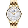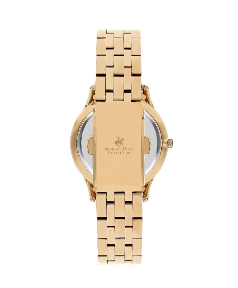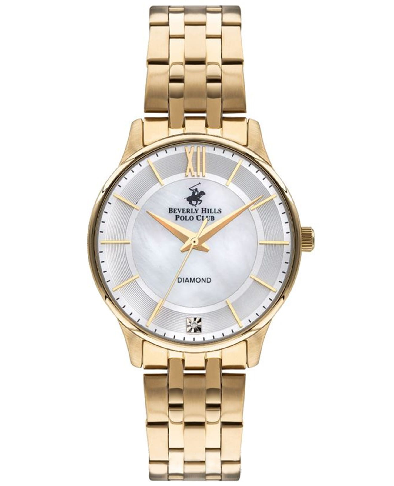 Американские женские часы с минеральным стеклом Beverly Hills Polo Club BP3309X.130, кварцевый механизм с высокой точностью. Класс водозащиты: 50 метров, позволит защитить корпус от случайных брызг или капель дождя. Корпус и браслет часов изготовлены из стали с IP-покрытиемIP-покрытиеМетод ионного напыления. Демонстрирует повышенную устойчивость к истиранию, окислению и химическим веществам. Под воздействием высокого давления и температуры около 1500°C молекулы металла надёжно соединяются с частицами корпуса часов. цвета желтое золото. Золотистый стальной браслет с раскладывающейся застёжкойРаскладная застёжкаТакой тип застёжки используется только на браслетах из металла. Она никогда не раскрывается полностью, происходит разделение на 2 и более частей. Раскладывающая застёжка снизит вероятность потери часов к минимуму.. Перламутровый циферблат инкрустирован одним бриллиантом.