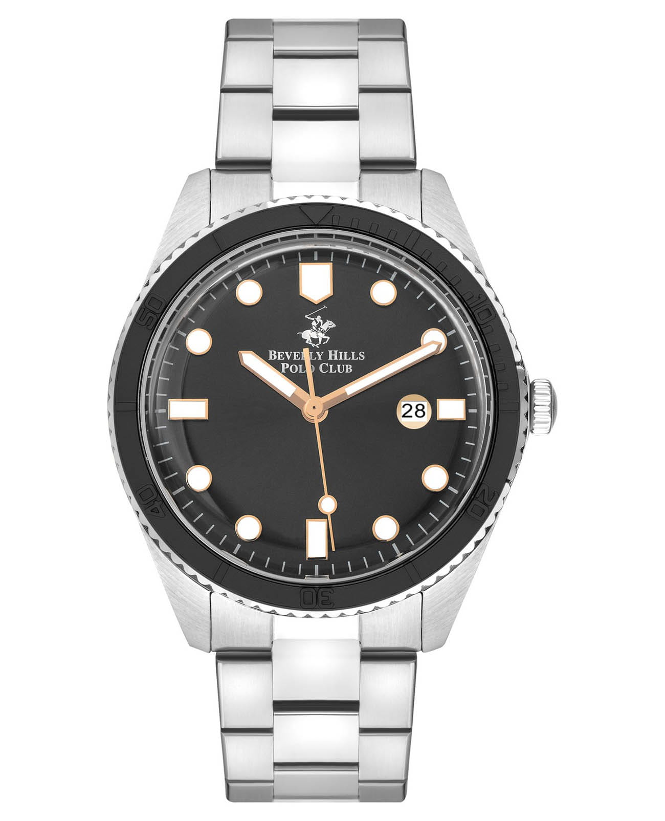Американские мужские часы Beverly Hills Polo Club BP3407X.360 с минеральным стекломМинеральное стеклоМинеральное стекло представляет собой искусственно выращенный минерал кварца. Такое стекло отличается особой устойчивостью к повреждениям и царапинам. Уступает по некоторым качествам сапфировому стеклу., кварцевый механизм с высокой точностью. Корпус и браслет часов изготовлен из нержавеющей стали. Вращающийся безельБезельВнешний ободок, закрепляющий стекло. В спортивных часах так называется поворотное кольцо с делениями на циферблате, выполняет роль таймера – замеряет отрезки времени на шкале. Неподвижный безель – элемент декора. Однонаправленно вращающийся безель на дайверских часах позволяет фиксировать моменты погружения и выныривания на поверхность. из нержавеющей стали с IP-покрытиемIP-покрытиеМетод ионного напыления. Демонстрирует повышенную устойчивость к истиранию, окислению и химическим веществам. Под воздействием высокого давления и температуры около 1500°C молекулы металла надёжно соединяются с частицами корпуса часов.. Стрелки с люминесцентной подсветкойЛюминесцентное покрытиеПозволяет считывать показания времени в темноте. Производители наносят на стрелки, часовые индексы, безель или поверхность циферблата светонакопительный состав, дающий холодное свечение..Окошко даты в положении 3 часов. Класс водозащиты: 100 метров, позволит плавать, нырять и заниматься другими водными видами спорта. Стальной браслет на раскладной застёжкеРаскладная застёжкаТакой тип застёжки используется только на браслетах из металла. Она никогда не раскрывается полностью, происходит разделение на 2 и более частей. Раскладывающая застёжка снизит вероятность потери часов к минимуму..