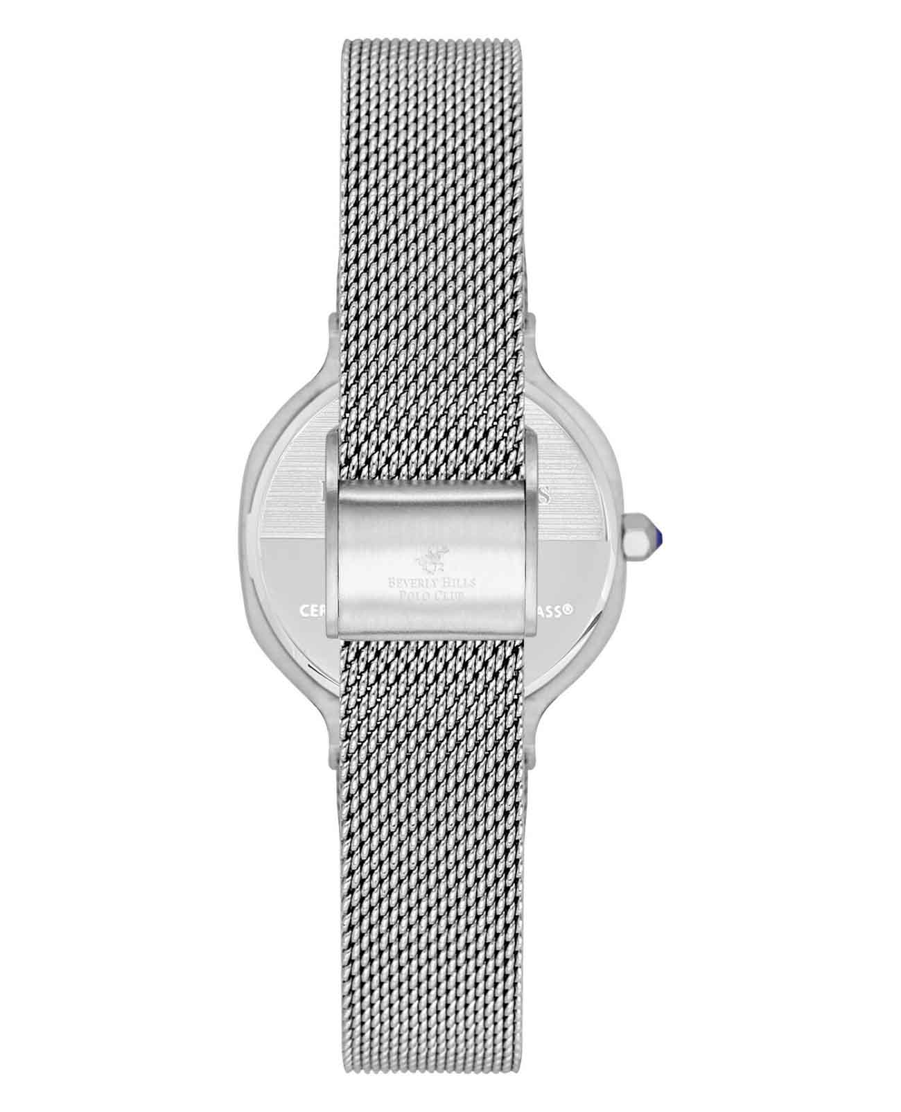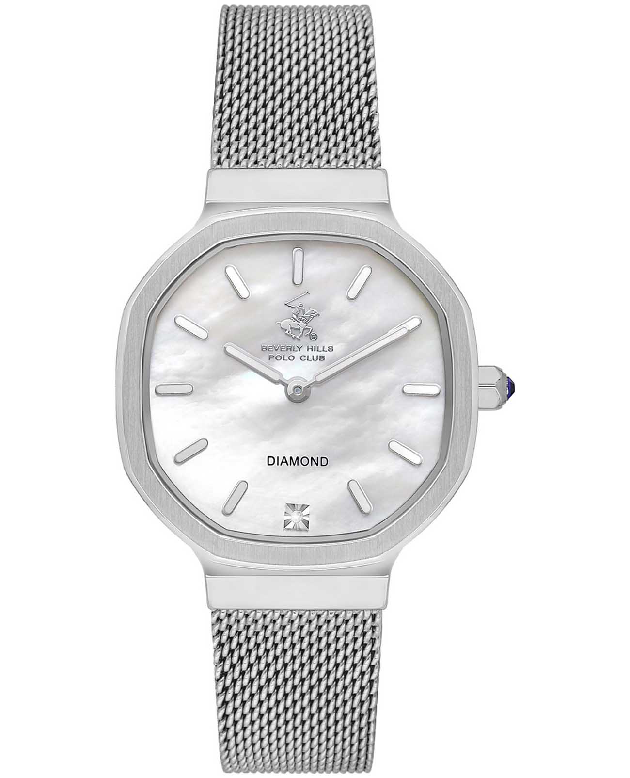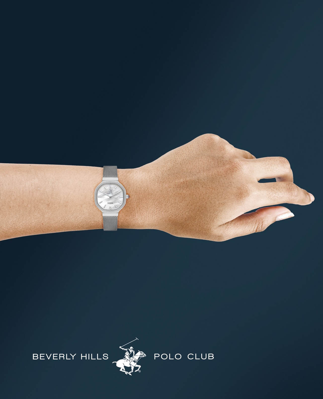 Женские наручные часы Beverly Hills Polo Club Quartz BP3621X.320 с надёжным кварцевым механизмом. Минеральное стеклоМинеральное стеклоМинеральное стекло представляет собой искусственно выращенный минерал кварца. Такое стекло отличается особой устойчивостью к повреждениям и царапинам. Уступает по некоторым качествам сапфировому стеклу. устойчивое к мелким механическим повреждениям. Корпус часов изготовлен из нержавеющей стали. Стрелки и метки с люминесцентным покрытиемЛюминесцентное покрытиеПозволяет считывать показания времени в темноте. Производители наносят на стрелки, часовые индексы, безель или поверхность циферблата светонакопительный состав, дающий холодное свечение.. Класс водозащиты: 50 метров, позволит защитить корпус от случайных брызг или капель дождя. Стальной браслет миланского плетения на раскладном замкеРаскладной замокДанный вариант застежки используется только на часах с металлическим браслетом. Отличительная особенность такого крепления в том, что длина браслета становится универсальной и вы можете самостоятельно отрегулировать нужный вам размер – застежка просто двигается по браслету часов..