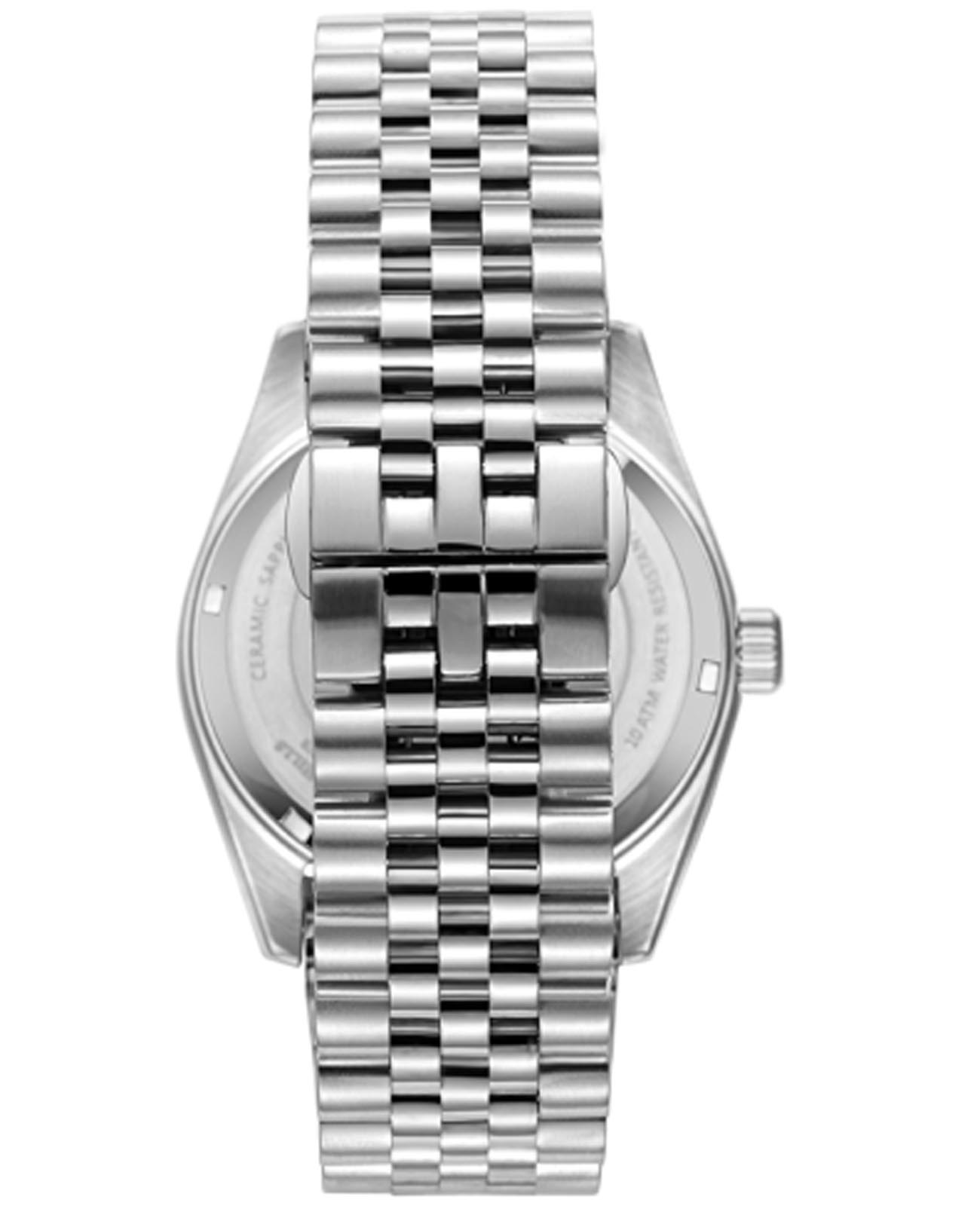 Завершает образ стальной браслет с раскладывающейся застежкой-бабочкойЗастёжка "бабочка"Такой вид застёжки дополняется предохранителями, помогающими избежать случайного раскрытия браслета. Обладают изящным исполнением. , обеспечивающей комфорт и уверенную фиксацию на запястье. Такая застежка выглядит стильно и практично.