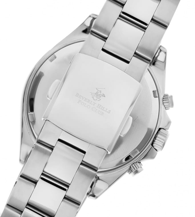 Американские мужские часы Beverly Hills Polo Club BP3127X.301 с минеральным стекломМинеральное стеклоМинеральное стекло представляет собой искусственно выращенный минерал кварца. Такое стекло отличается особой устойчивостью к повреждениям и царапинам. Уступает по некоторым качествам сапфировому стеклу.. Кварцевый механизм высокой точности. Корпус и браслет часов изготовлены из нержавеющей стали. Стрелки и метки с люминесцентным покрытиемЛюминесцентное покрытиеПозволяет считывать показания времени в темноте. Производители наносят на стрелки, часовые индексы, безель или поверхность циферблата светонакопительный состав, дающий холодное свечение.. Окошко даты находится в положении между 4 и 5 часов. Стальной браслет на раскладной застёжкеРаскладная застёжкаТакой тип застёжки используется только на браслетах из металла. Она никогда не раскрывается полностью, происходит разделение на 2 и более частей. Раскладывающая застёжка снизит вероятность потери часов к минимуму.. Класс водозащиты: 50 метров, позволит защитить корпус от случайных брызг или капель дождя. День недели, 24-х часовой формат времени и второй часовой поясВторой часовой поясФункция, позволяющая отображать время двух часовых поясов одновременно. отображены на дополнительных циферблатах. БезельБезельВнешний ободок, закрепляющий стекло. В спортивных часах так называется поворотное кольцо с делениями на циферблате, выполняет роль таймера – замеряет отрезки времени на шкале. Неподвижный безель – элемент декора. Однонаправленно вращающийся безель на дайверских часах позволяет фиксировать моменты погружения и выныривания на поверхность. с IP-покрытиемIP-покрытиеМетод ионного напыления. Демонстрирует повышенную устойчивость к истиранию, окислению и химическим веществам. Под воздействием высокого давления и температуры около 1500°C молекулы металла надёжно соединяются с частицами корпуса часов. и шкалой тахиметраТахиметрРазмеченная шкала, располагается на ободке или безеле часов. Тахиметр позволяет рассчитать скорость на определённом участке пути, расстояние измеряется в километрах или милях..