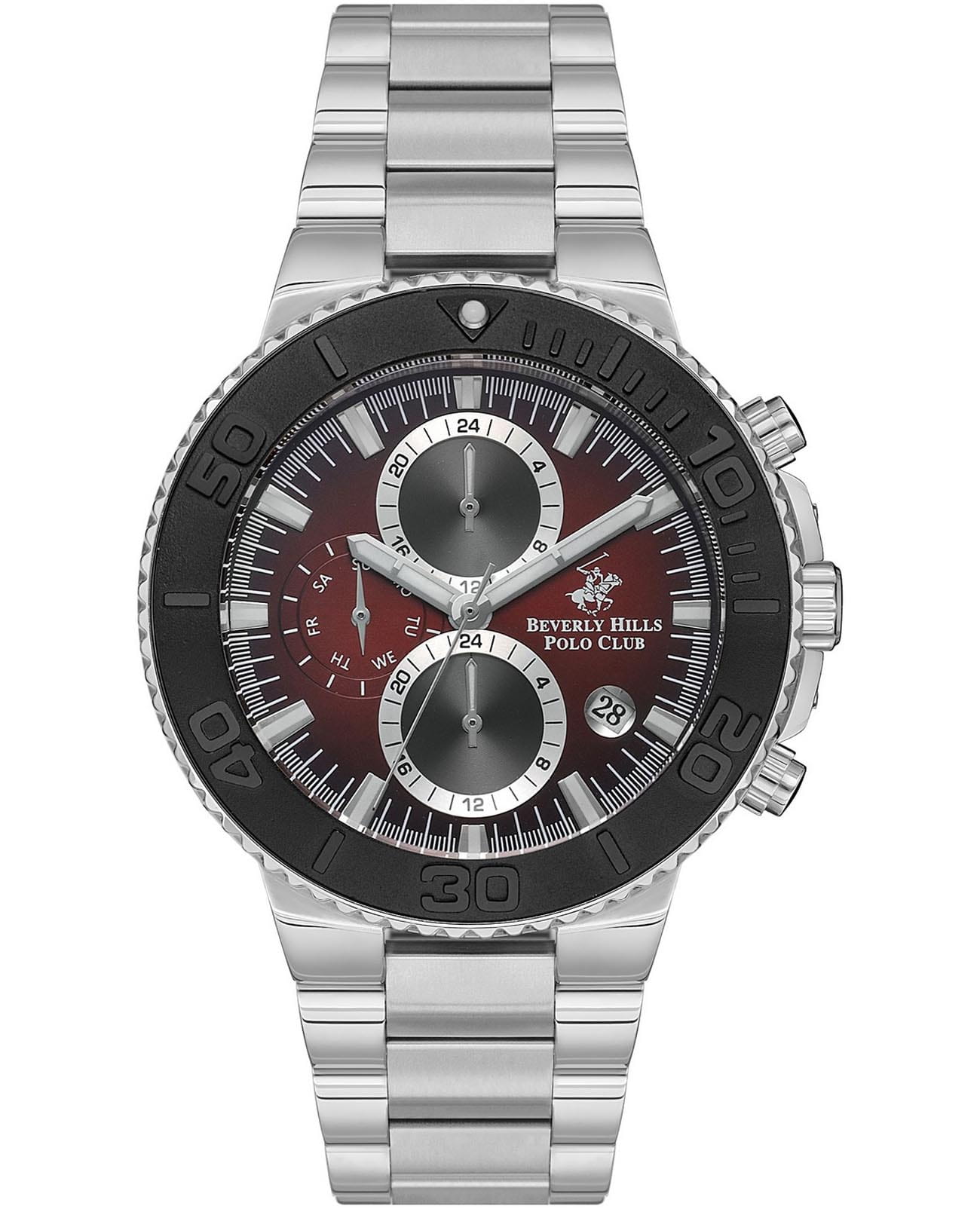 Американские мужские часы-хронографХронографФункция позволяет измерять отрезки времени с особой точностью: часы, минуты, секунды. Верным признаком хронографа является наличие на циферблате 3 дополнительных окошек-счётчиков. Beverly Hills Polo Club BP3540X.380 с минеральным стекломМинеральное стеклоМинеральное стекло представляет собой искусственно выращенный минерал кварца. Такое стекло отличается особой устойчивостью к повреждениям и царапинам. Уступает по некоторым качествам сапфировому стеклу., кварцевый механизм с высокой точностью. Класс водозащиты: 50 метров, позволит защитить корпус от случайных брызг или капель дождя. Стальной браслет на раскладной застёжкойРаскладная застёжкаТакой тип застёжки используется только на браслетах из металла. Она никогда не раскрывается полностью, происходит разделение на 2 и более частей. Раскладывающая застёжка снизит вероятность потери часов к минимуму.. Окошко даты находится в положении между 4 и 5 часов. На отдельных циферблатах отражены день недели, 24-х часовой формат времени и второй часовой поясВторой часовой поясФункция, позволяющая отображать время двух часовых поясов одновременно.. Стрелки и метки с люминесцентным покрытиемЛюминесцентное покрытиеПозволяет считывать показания времени в темноте. Производители наносят на стрелки, часовые индексы, безель или поверхность циферблата светонакопительный состав, дающий холодное свечение.. Вращающийся безельБезельВнешний ободок, закрепляющий стекло. В спортивных часах так называется поворотное кольцо с делениями на циферблате, выполняет роль таймера – замеряет отрезки времени на шкале. Неподвижный безель – элемент декора. Однонаправленно вращающийся безель на дайверских часах позволяет фиксировать моменты погружения и выныривания на поверхность. с IP-покрытиемIP-покрытиеМетод ионного напыления. Демонстрирует повышенную устойчивость к истиранию, окислению и химическим веществам. Под воздействием высокого давления и температуры около 1500°C молекулы металла надёжно соединяются с частицами корпуса часов..