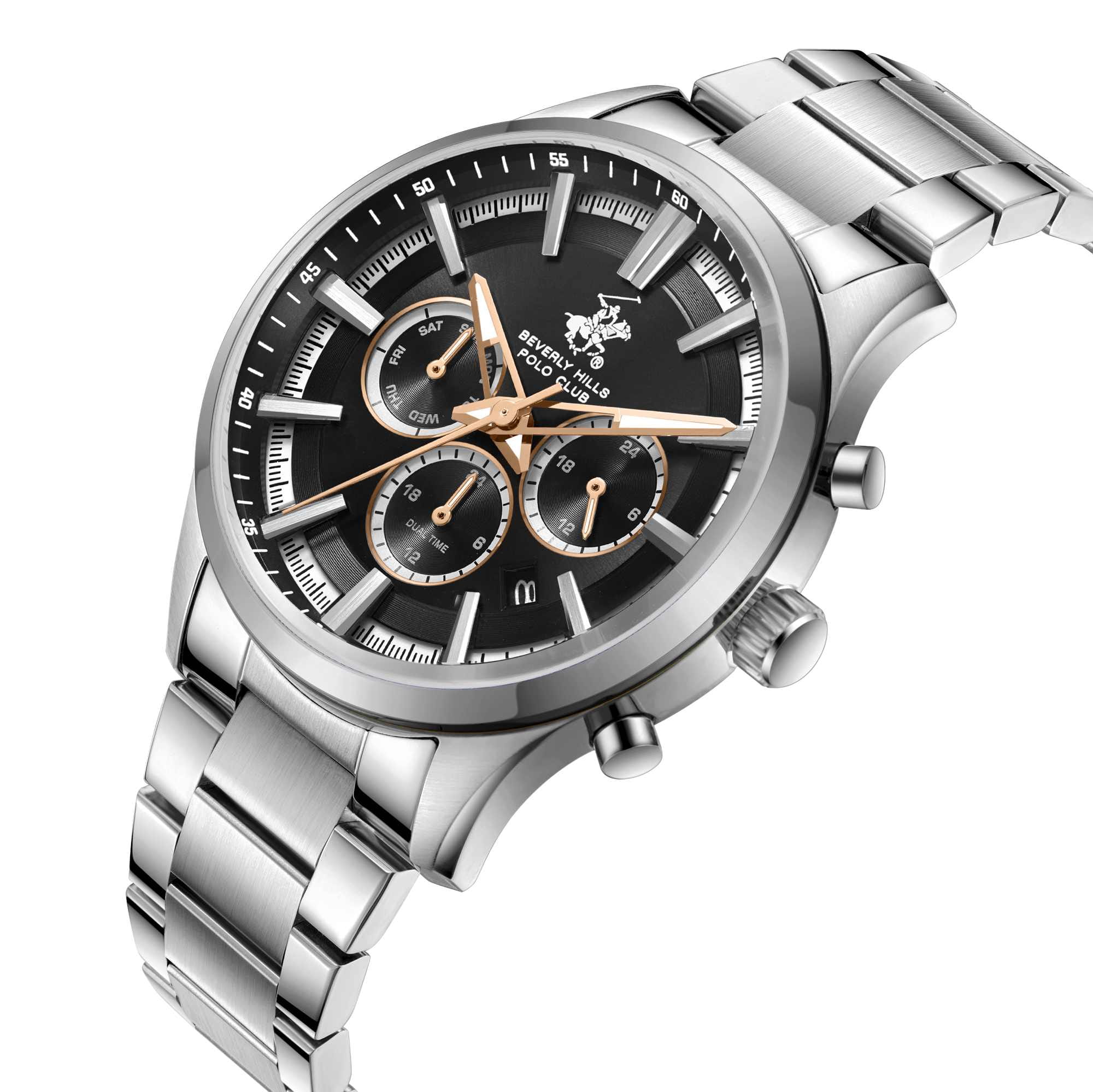 Мужские кварцевые часы Beverly Hills Polo Club — это воплощение лаконичности и эффектного стиля. Корпус диаметром 42 мм выполнен из нержавеющей стали. Циферблат чёрного цвета оформлен штрихами, стрелками и тремя вынесенными субциферблатами: для отображения дня недели, даты и 24-часового формата времени. Стрелки с люминесцентным покрытиемЛюминесцентное покрытиеПозволяет считывать показания времени в темноте. Производители наносят на стрелки, часовые индексы, безель или поверхность циферблата светонакопительный состав, дающий холодное свечение., обеспечивающим хорошую читаемость в темноте. Циферблат защищён минеральным стекломМинеральное стеклоМинеральное стекло представляет собой искусственно выращенный минерал кварца. Такое стекло отличается особой устойчивостью к повреждениям и царапинам. Уступает по некоторым качествам сапфировому стеклу. с сапфировым покрытием. Часы оснащены браслетом из нержавеющей стали на раскладной застёжкеРаскладная застёжкаТакой тип застёжки используется только на браслетах из металла. Она никогда не раскрывается полностью, происходит разделение на 2 и более частей. Раскладывающая застёжка снизит вероятность потери часов к минимуму.. Водонепроницаемость 50 м позволяет использовать часы при мытье рук или в дождь. Идеальный выбор для тех, кто ценит американское качество и универсальный дизайн.