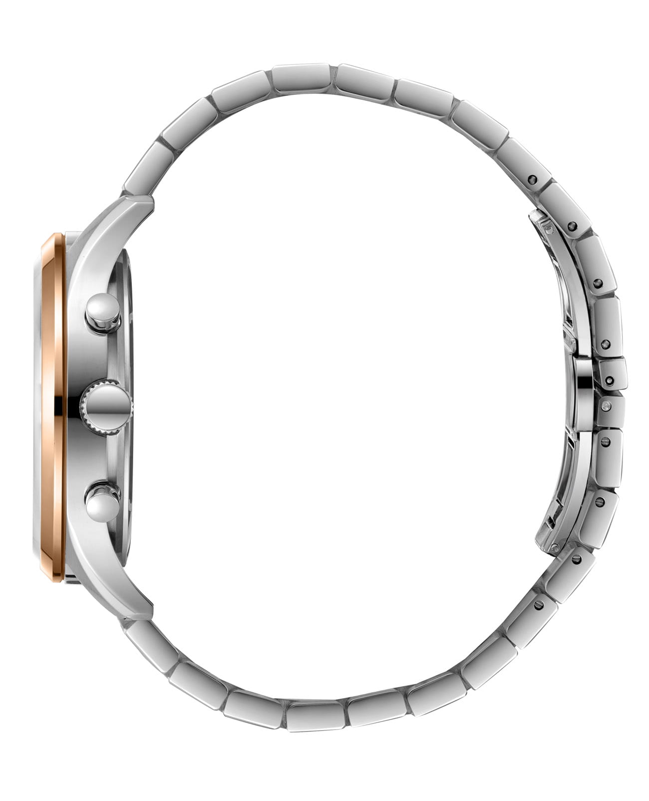 Циферблат защищен минеральным стекломМинеральное стеклоМинеральное стекло представляет собой искусственно выращенный минерал кварца. Такое стекло отличается особой устойчивостью к повреждениям и царапинам. Уступает по некоторым качествам сапфировому стеклу. с сапфировым покрытием, которое устойчиво к появлению царапин и сохраняет чистоту взгляда на протяжении длительного времени. Стрелки оснащены люминесцентным покрытиемЛюминесцентное покрытиеПозволяет считывать показания времени в темноте. Производители наносят на стрелки, часовые индексы, безель или поверхность циферблата светонакопительный состав, дающий холодное свечение., обеспечивающим отличную видимость даже при слабом освещении. БезельБезельВнешний ободок, закрепляющий стекло. В спортивных часах так называется поворотное кольцо с делениями на циферблате, выполняет роль таймера – замеряет отрезки времени на шкале. Неподвижный безель – элемент декора. Однонаправленно вращающийся безель на дайверских часах позволяет фиксировать моменты погружения и выныривания на поверхность. с IP-покрытиемIP-покрытиеМетод ионного напыления. Демонстрирует повышенную устойчивость к истиранию, окислению и химическим веществам. Под воздействием высокого давления и температуры около 1500°C молекулы металла надёжно соединяются с частицами корпуса часов..