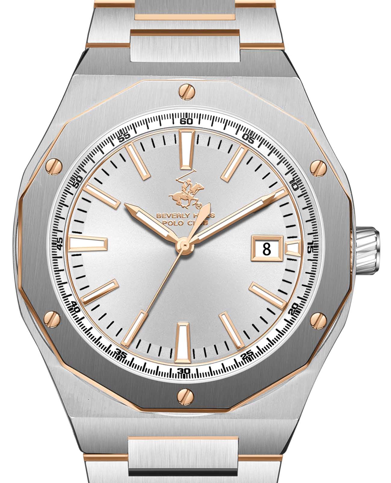 Американские мужские часы Beverly Hills Polo Club BP3788X.530 - это стильный мужской аксессуар, который сочетает элегантный дизайн и практичность. Корпус выполнен из нержавеющей стали серебристого цвета, диаметром 43 мм, что обеспечивает долговечность и утончённый внешний вид. Надежное минеральное стеклоМинеральное стеклоМинеральное стекло представляет собой искусственно выращенный минерал кварца. Такое стекло отличается особой устойчивостью к повреждениям и царапинам. Уступает по некоторым качествам сапфировому стеклу. с сапфировым покрытием защищает циферблат от царапин и обеспечивает долговечность. Неподвижный безельБезельВнешний ободок, закрепляющий стекло. В спортивных часах так называется поворотное кольцо с делениями на циферблате, выполняет роль таймера – замеряет отрезки времени на шкале. Неподвижный безель – элемент декора. Однонаправленно вращающийся безель на дайверских часах позволяет фиксировать моменты погружения и выныривания на поверхность. с частичным IP-покрытиемIP-покрытиеМетод ионного напыления. Демонстрирует повышенную устойчивость к истиранию, окислению и химическим веществам. Под воздействием высокого давления и температуры около 1500°C молекулы металла надёжно соединяются с частицами корпуса часов.. Модель оснащена кварцевым механизмом, обеспечивающим высокую точность хода. Стальной браслет на застёжке-бабочке с кнопкамиЗастёжка "бабочка"Такой вид застёжки дополняется предохранителями, помогающими избежать случайного раскрытия браслета. Обладают изящным исполнением. с частичным IP-покрытиемIP-покрытиеМетод ионного напыления. Демонстрирует повышенную устойчивость к истиранию, окислению и химическим веществам. Под воздействием высокого давления и температуры около 1500°C молекулы металла надёжно соединяются с частицами корпуса часов. цвета розового золота обеспечивает комфортное ношение. Окошко даты находится в положении 3 часа. Стрелки и метки с люминесцентным покрытиемЛюминесцентное покрытиеПозволяет считывать показания времени в темноте. Производители наносят на стрелки, часовые индексы, безель или поверхность циферблата светонакопительный состав, дающий холодное свечение. позволяют легко считывать время даже в условиях недостаточного освещения. Водозащита 50 метров позволит защитить корпус от случайных брызг или капель дождя. Эта модель – отличный выбор для тех, кто ищет сочетание стиля, качества и функциональности. Часы станут не только полезным аксессуаром, но и выразительным элементом вашего имиджа.
