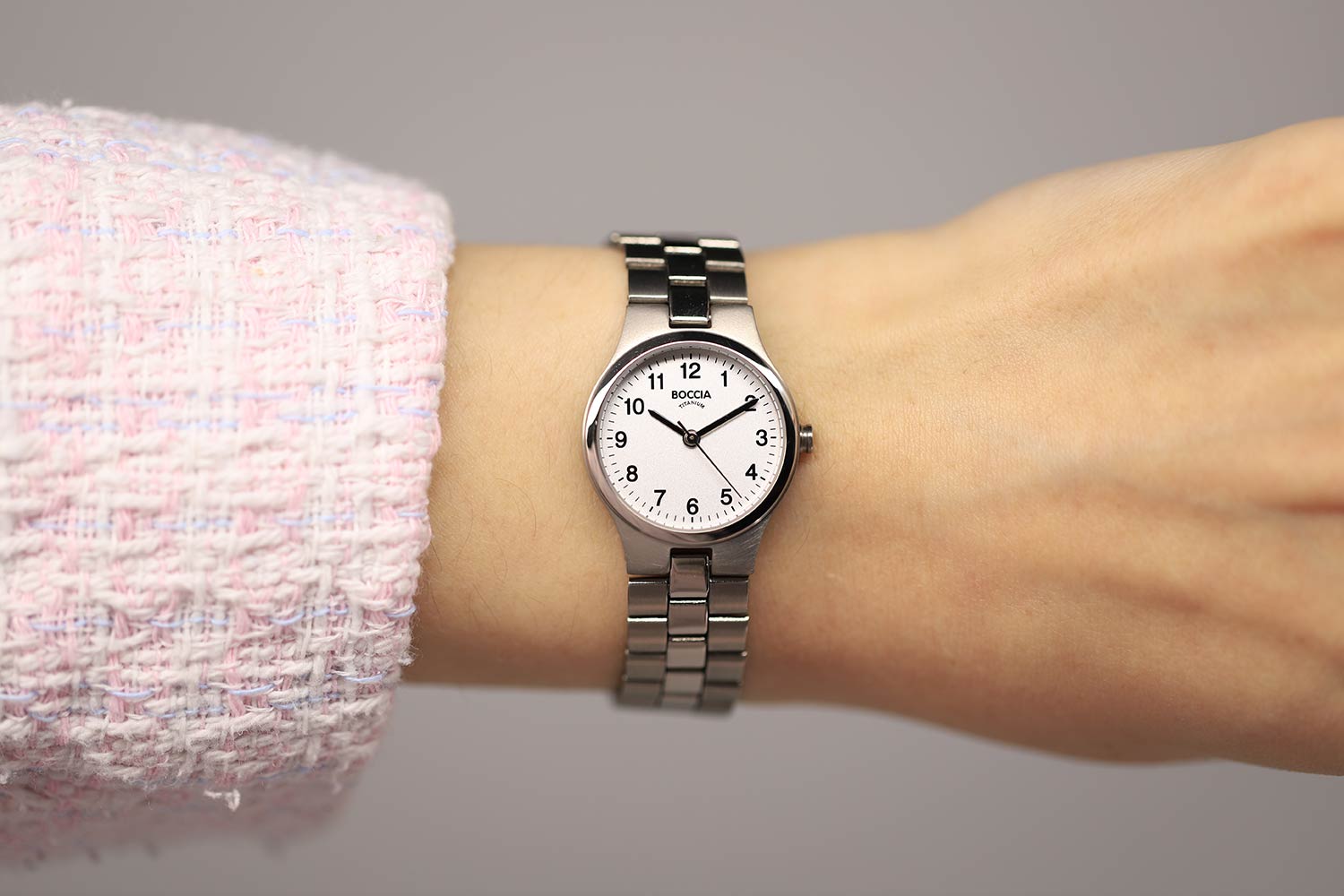 Женские наручные часы Boccia Titanium 3082-06 с надёжным кварцевым механизмом. Корпус часов изготовлен из титана. Титановый браслет на раскладной застёжкеРаскладная застёжкаТакой тип застёжки используется только на браслетах из металла. Она никогда не раскрывается полностью, происходит разделение на 2 и более частей. Раскладывающая застёжка снизит вероятность потери часов к минимуму.. Минеральное стеклоМинеральное стеклоМинеральное стекло представляет собой искусственно выращенный минерал кварца. Такое стекло отличается особой устойчивостью к повреждениям и царапинам. Уступает по некоторым качествам сапфировому стеклу. устойчивое к мелким механическим повреждениям. Класс водозащиты: 50 метров, позволит защитить корпус от случайных брызг или капель дождя.