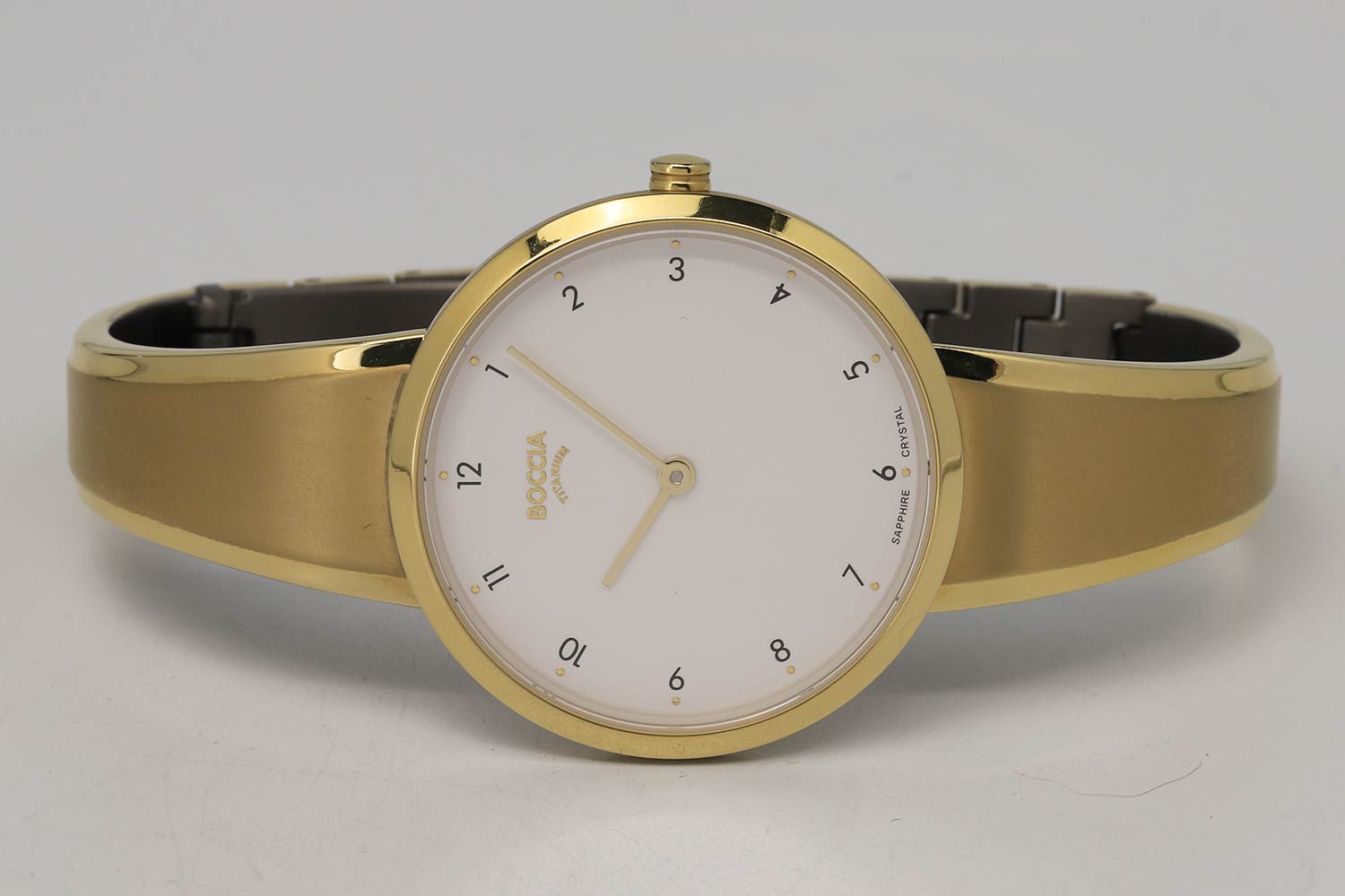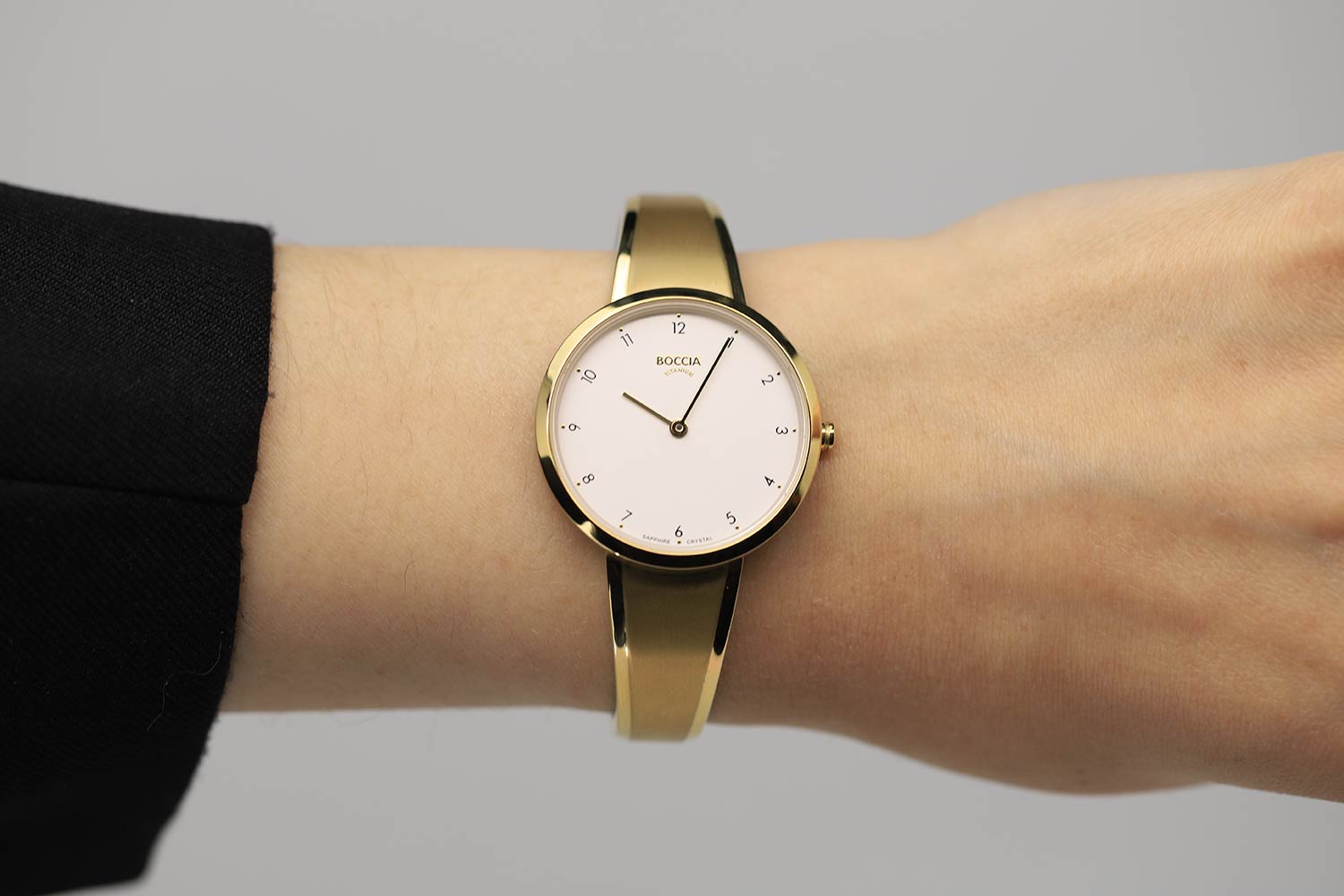 Женские немецкие наручные часы Boccia Titanium 3325-03 с надёжным кварцевым механизмом. Корпус и браслет часов изготовлены из титана с PVD-покрытиемPVDУльтратонкое покрытие наносится в технике вакуумного напыления, сочетает в себе нитрид титана особой прочности со слоем золота или оксида хрома. Несёт в себе декоративную или защитную функцию.. Сапфировое стеклоСапфировое стеклоПрочный и надёжный материал из кристалла сапфира синтетического происхождения, характеризующийся особой твёрдостью и устойчивостью к царапинам и повреждениям. устойчивое к мелким механическим повреждениям. Класс водозащиты: 30 метров, позволит защитить корпус от случайных брызг или капель дождя. Титановый браслет на раскладной застёжкеРаскладная застёжкаТакой тип застёжки используется только на браслетах из металла. Она никогда не раскрывается полностью, происходит разделение на 2 и более частей. Раскладывающая застёжка снизит вероятность потери часов к минимуму..