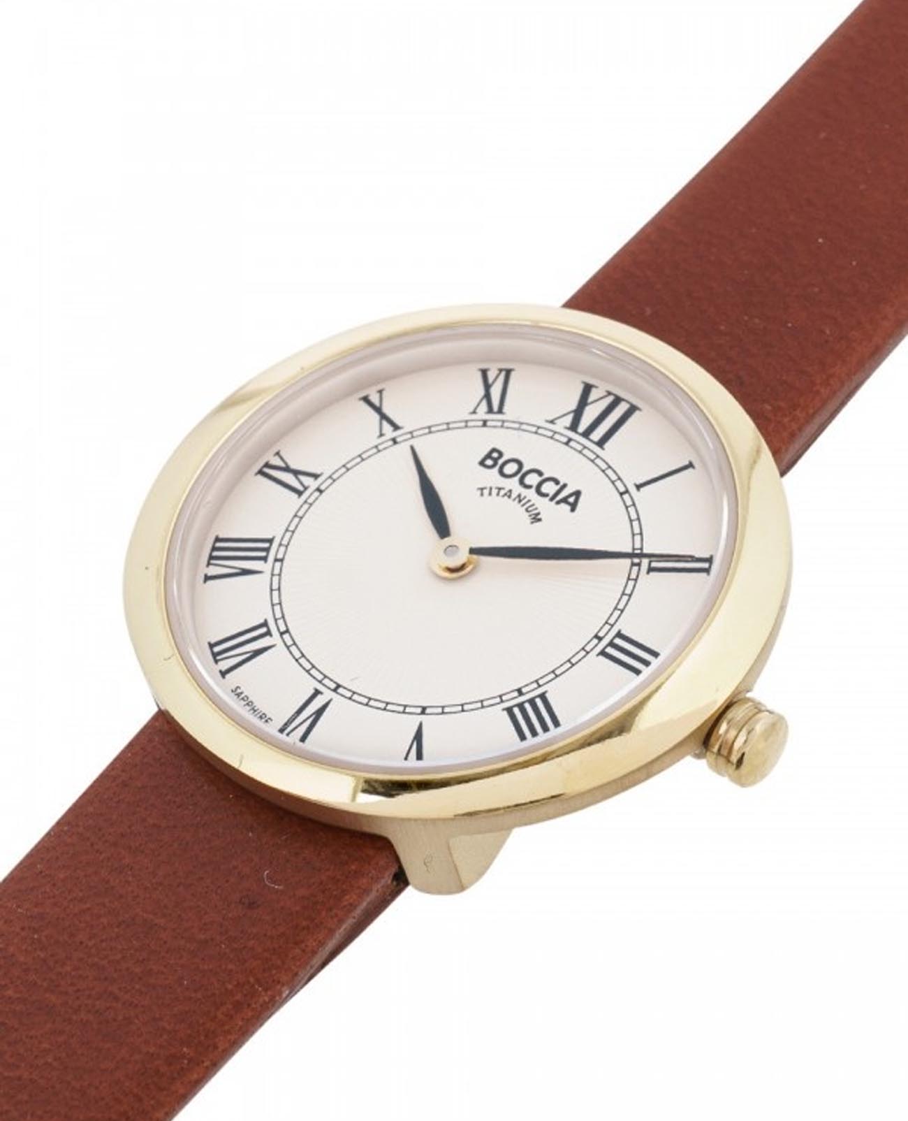 Женские немецкие титановые часы Boccia Titanium 3344-03, кварцевый механизм с высокой точностью. Сапфировое стеклоСапфировое стеклоПрочный и надёжный материал из кристалла сапфира синтетического происхождения, характеризующийся особой твёрдостью и устойчивостью к царапинам и повреждениям. устойчивое к мелким механическим повреждениям. Корпус изготовлен из титана с PVD-покрытиемPVDУльтратонкое покрытие наносится в технике вакуумного напыления, сочетает в себе нитрид титана особой прочности со слоем золота или оксида хрома. Несёт в себе декоративную или защитную функцию.. Метки в виде римских цифр. Класс водозащиты: 50 метров, позволит защитить корпус от случайных брызг или капель дождя. Кожаный ремешок на стандартной застёжке.