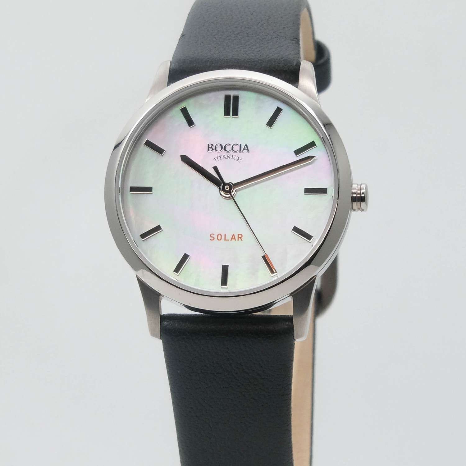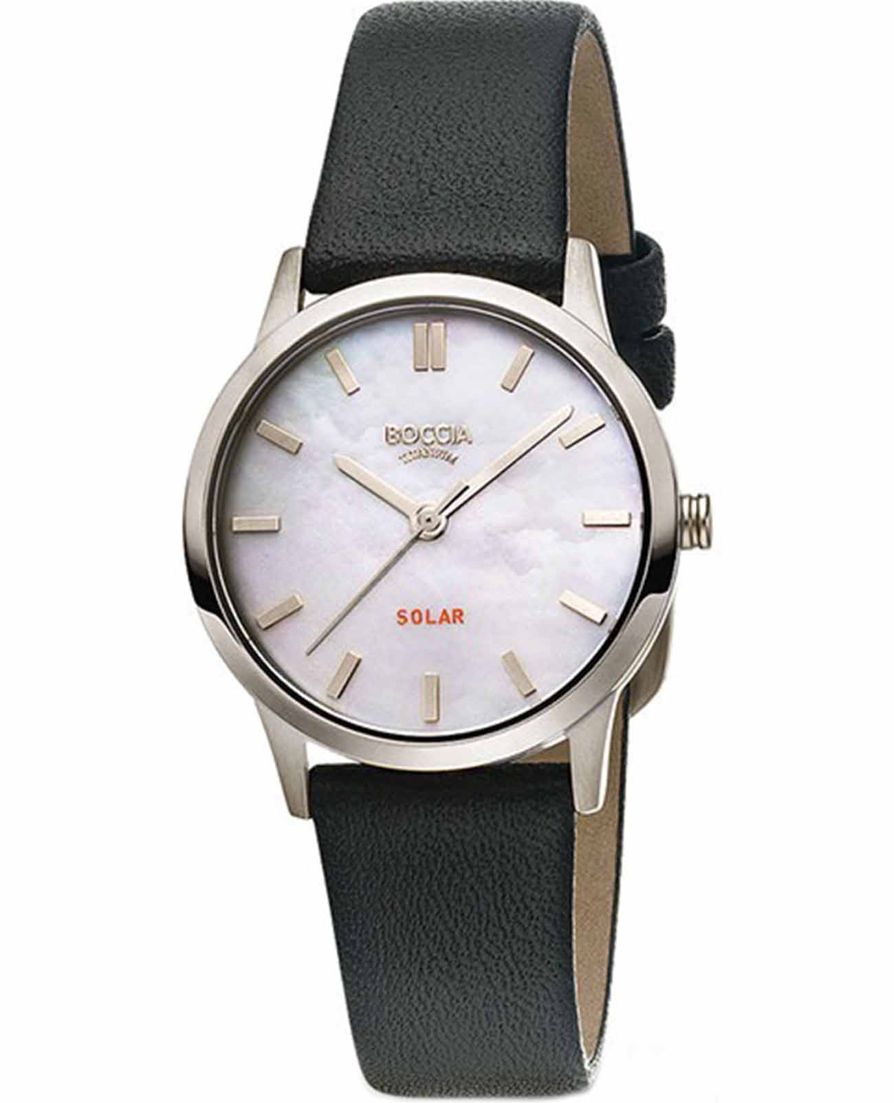 Часы Boccia 3363-01 — это утонченный аксессуар для женщин, сочетающий в себе элегантность и надежность. Эти кварцевые часы оснащены солнечной батареей. Белый перламутровый циферблат придает модели классическую изысканность, гармонично сочетаясь с круглым корпусом из гипоаллергенного титана. Диаметр корпуса составляет 30 мм, что делает часы аккуратными и элегантными, идеально подходящими для женской руки. Черный кожаный ремешок с классической застежкой добавляет комфорта и завершает стильный образ. Часы защищены прочным минеральным стекломМинеральное стеклоМинеральное стекло представляет собой искусственно выращенный минерал кварца. Такое стекло отличается особой устойчивостью к повреждениям и царапинам. Уступает по некоторым качествам сапфировому стеклу., устойчивым к мелким механическим повреждениям, что обеспечивает их долговечность и сохранение презентабельного вида. Водостойкость на уровне WR 50 позволяет не беспокоиться о попадании воды при мытье рук или в дождливую погоду.