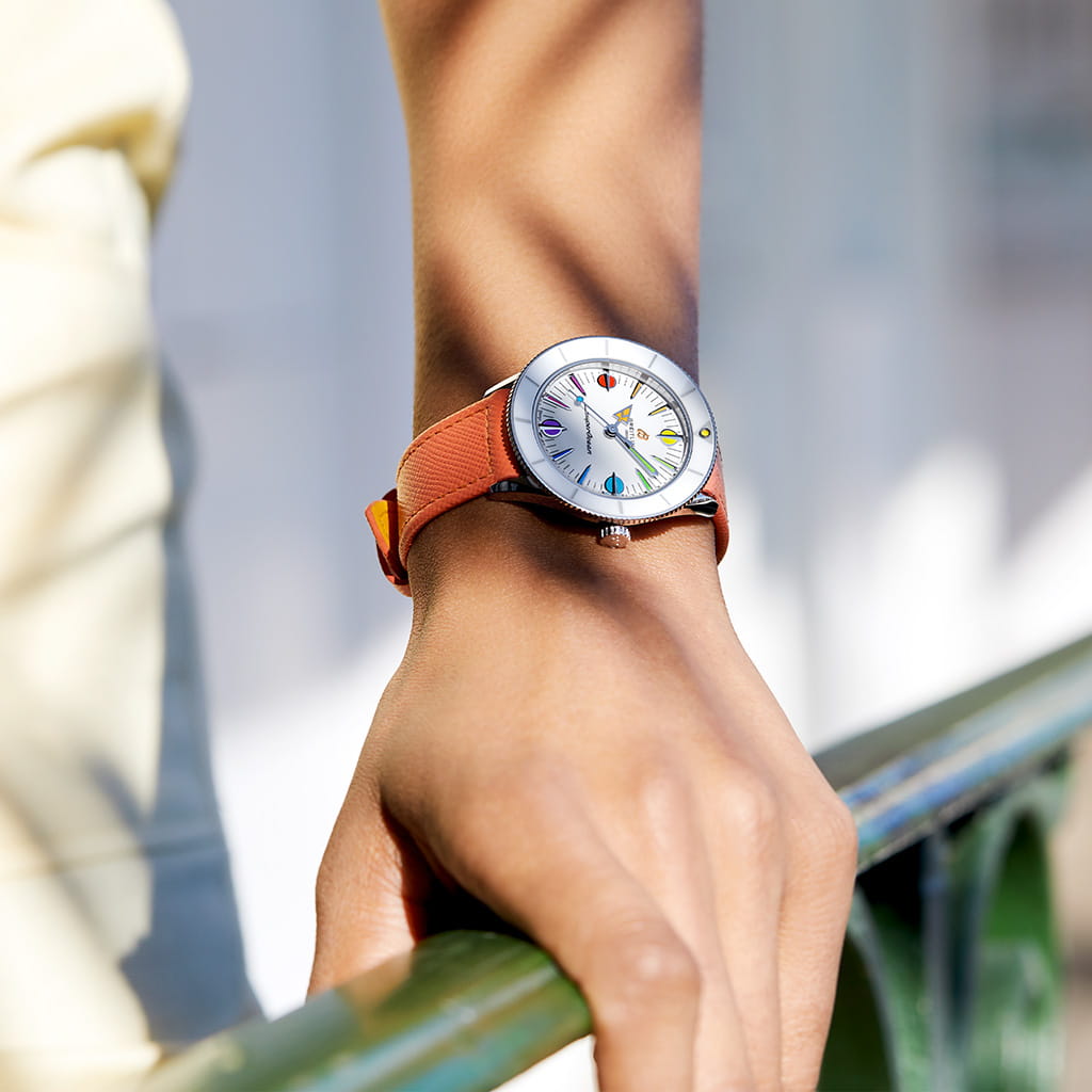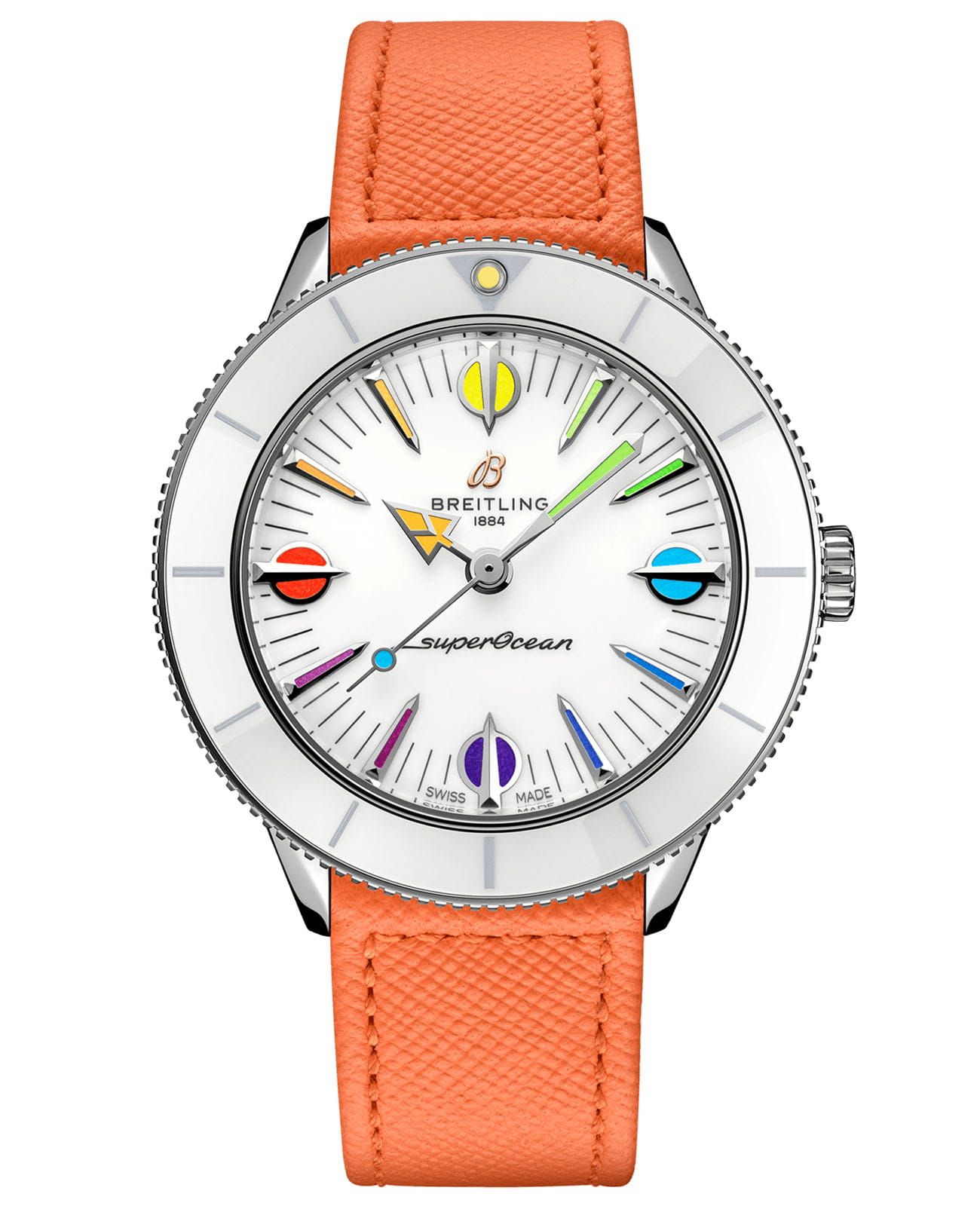 Красочная дань уважения часовой компании Breitling оригинальной модели SuperOcean и воплощение пляжного стиля. В капсульной коллекции Superocean Heritage ’57 Pastel Paradise использованы некоторые элементы дизайна первой модели SuperOcean 1957 года выпуска, такие как вогнутый керамический безель, крупные индексы и часовая стрелка в форме стрелы.