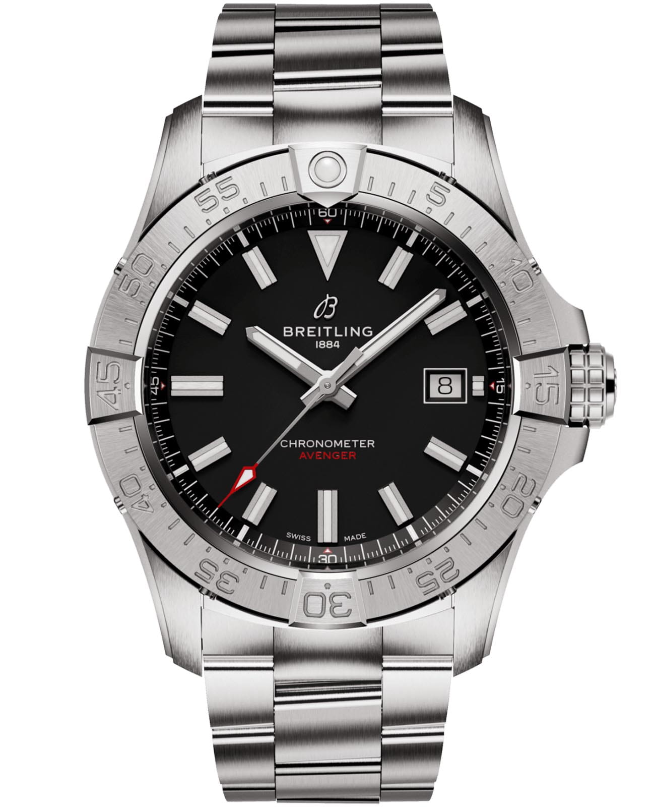 Мужские наручные часы Breitling Avenger Automatic 42 A17328101B1A1 с надёжным автоматическим механизмом. Сапфировое стеклоСапфировое стеклоПрочный и надёжный материал из кристалла сапфира синтетического происхождения, характеризующийся особой твёрдостью и устойчивостью к царапинам и повреждениям. повышенной прозрачности, устойчивое к мелким механическим повреждениям. Вращающийся безельБезельВнешний ободок, закрепляющий стекло. В спортивных часах так называется поворотное кольцо с делениями на циферблате, выполняет роль таймера – замеряет отрезки времени на шкале. Неподвижный безель – элемент декора. Однонаправленно вращающийся безель на дайверских часах позволяет фиксировать моменты погружения и выныривания на поверхность.. Окошко даты находится в положении 3 часа. Стрелки и метки с люминесцентным покрытиемЛюминесцентное покрытиеПозволяет считывать показания времени в темноте. Производители наносят на стрелки, часовые индексы, безель или поверхность циферблата светонакопительный состав, дающий холодное свечение.. Стальной браслет на стандартной застёжке. Класс водозащиты: 300 метров, позволит плавать, нырять и заниматься другими водными видами спорта.