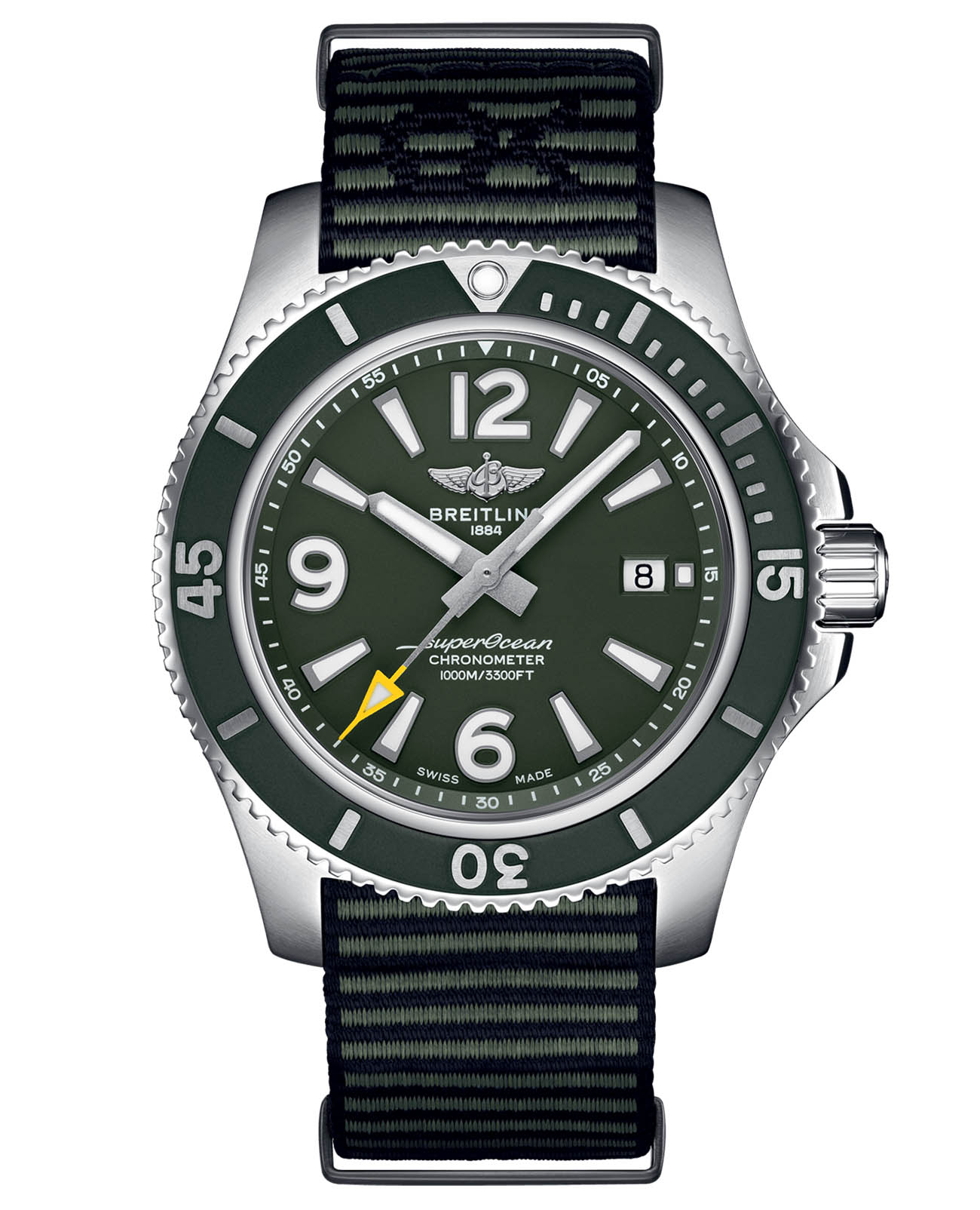 Эта модель выполнена в прочном корпусе из нержавеющей стали диаметром 44 мм с матовым зеленым циферблатом. Она поставляется в комплекте с зеленым цельным ремешком из волокна ECONYL®, изготовленного из нейлоновых отходов, извлекаемых из океана – например, из рыболовных сетей. Эта модель не только с достоинством выдержит погружение на морские глубины (до 100 бар/1000 метров) – часы Superocean Automatic 44 Outerknown равным образом понравятся и тем, чьи амбиции лежат ближе к берегу.