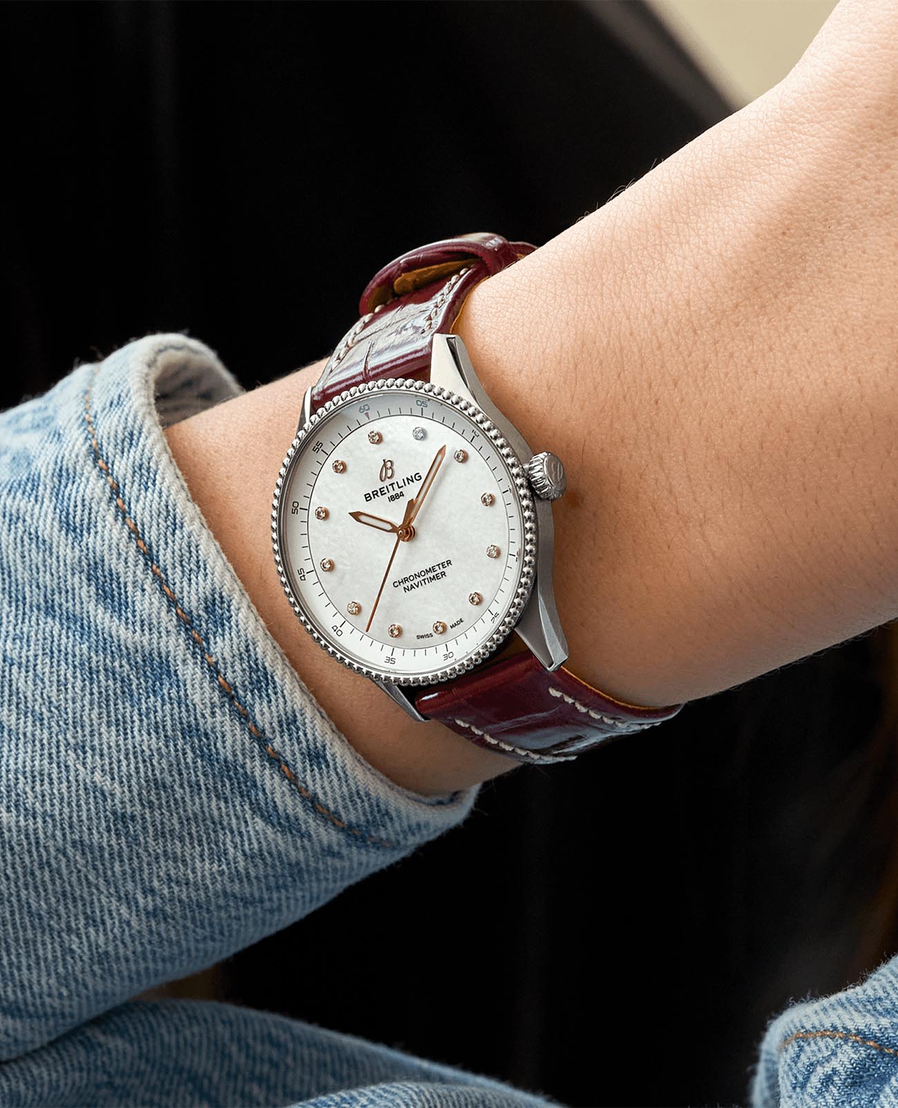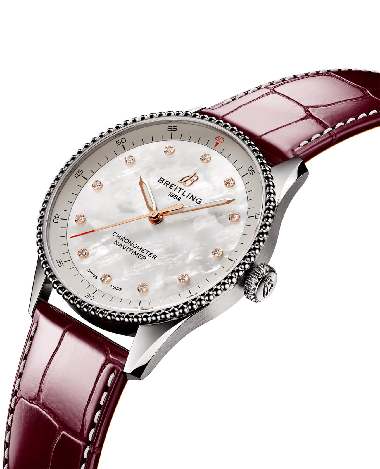 Швейцарские унисекс часы-хронометр Breitling Navitimer Automatic 36 A77320E61A2P2, механический механизм (автоматический калибр) с высокой точностью. Сапфировое стеклоСапфировое стеклоПрочный и надёжный материал из кристалла сапфира синтетического происхождения, характеризующийся особой твёрдостью и устойчивостью к царапинам и повреждениям. устойчивое к появлению царапин, обладающее высокой прозрачностью. Класс водозащиты: 50 метров, позволит защитить корпус от случайных брызг или капель дождя. Корпус часов изготовлен из нержавеющей стали. Ремешок из кожи аллигатора с раскладной застёжкойРаскладная застёжкаТакой тип застёжки используется только на браслетах из металла. Она никогда не раскрывается полностью, происходит разделение на 2 и более частей. Раскладывающая застёжка снизит вероятность потери часов к минимуму.. Стрелки с люминесцентным покрытиемЛюминесцентное покрытиеПозволяет считывать показания времени в темноте. Производители наносят на стрелки, часовые индексы, безель или поверхность циферблата светонакопительный состав, дающий холодное свечение.. Циферблат инкрустирован бриллантами.