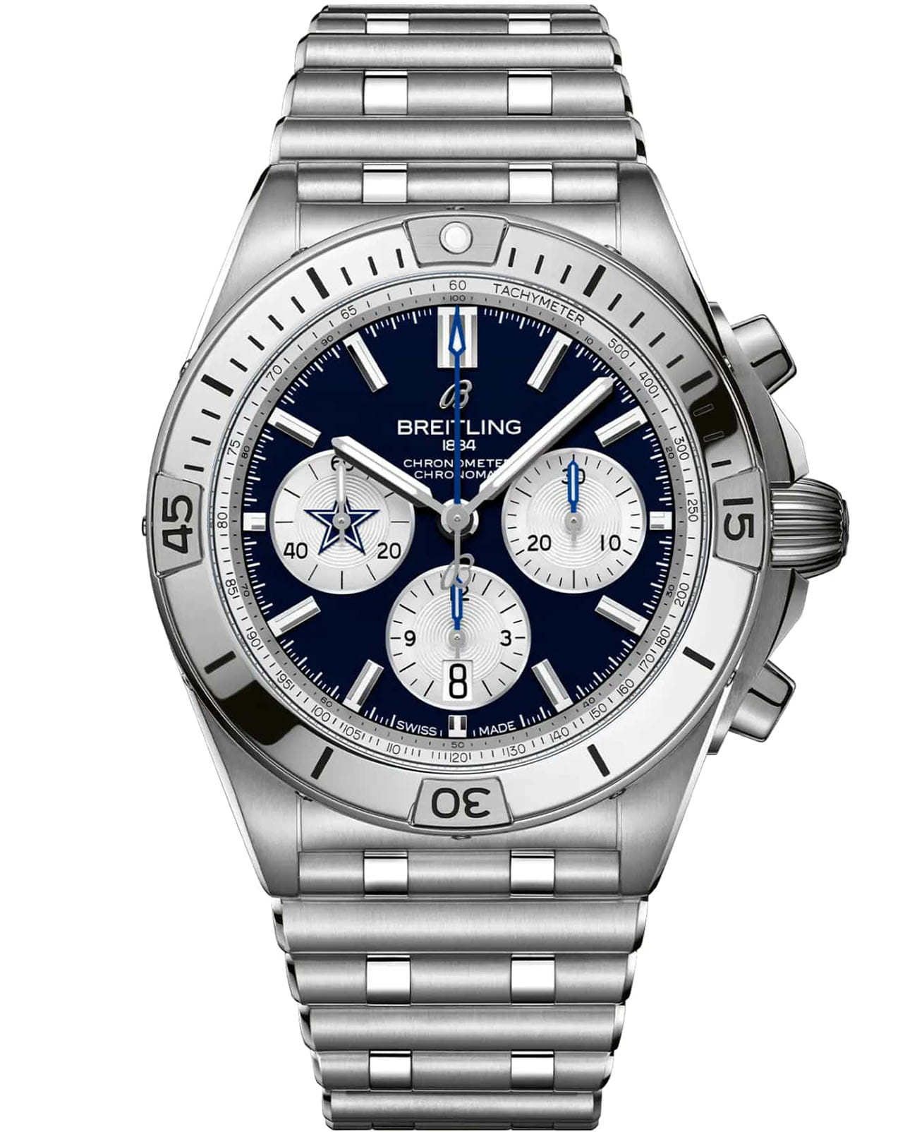Мужские швейцарские часы-хронограф с секундомером Breitling Chronomat B01 42 NFL Dallas Cowboys Edition, механический механизм (автоматический калибр) с высокой точностью. Сапфировое стеклоСапфировое стеклоПрочный и надёжный материал из кристалла сапфира синтетического происхождения, характеризующийся особой твёрдостью и устойчивостью к царапинам и повреждениям. устойчивое к появлению царапин, обладающее высокой прозрачностью. Класс водозащиты: 200 метров, позволит плавать, нырять и заниматься другими водными видами спорта. Корпус часов изготовлен из нержавеющей стали. Стальной браслет на застёжке «бабочка» с кнопкамиЗастёжка "бабочка"Такой вид застёжки дополняется предохранителями, помогающими избежать случайного раскрытия браслета. Обладают изящным исполнением. . Стрелки и метки с люминесцентным покрытиемЛюминесцентное покрытиеПозволяет считывать показания времени в темноте. Производители наносят на стрелки, часовые индексы, безель или поверхность циферблата светонакопительный состав, дающий холодное свечение.. Шкала тахиметра на циферблате. Окошко даты находится в положении 6 часов.