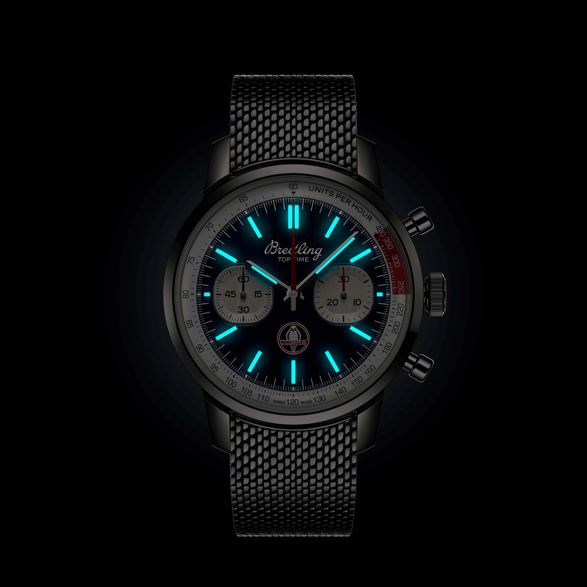 Мужские швейцарские часы-хронографХронографФункция позволяет измерять отрезки времени с особой точностью: часы, минуты, секунды. Верным признаком хронографа является наличие на циферблате 3 дополнительных окошек-счётчиков. с тахиметромТахиметрРазмеченная шкала, располагается на ободке или безеле часов. Тахиметр позволяет рассчитать скорость на определённом участке пути, расстояние измеряется в километрах или милях. Breitling Top Time B01 Shelby Cobra AB01763A1C1A1, механический механизм (автоматический калибр) с высокой точностью. Сапфировое стеклоСапфировое стеклоПрочный и надёжный материал из кристалла сапфира синтетического происхождения, характеризующийся особой твёрдостью и устойчивостью к царапинам и повреждениям. устойчивое к появлению царапин, обладающее высокой прозрачностью. Класс водозащиты: 100 метров, позволит плавать, нырять и заниматься другими водными видами спорта. Корпус часов изготовлен из стали. Стрелки и метки с люминесцентным покрытиемЛюминесцентное покрытиеПозволяет считывать показания времени в темноте. Производители наносят на стрелки, часовые индексы, безель или поверхность циферблата светонакопительный состав, дающий холодное свечение.. Стальной браслет с застёжкой-бабочкой с кнопкамиЗастёжка "бабочка"Такой вид застёжки дополняется предохранителями, помогающими избежать случайного раскрытия браслета. Обладают изящным исполнением. . Неподвижный безельБезельВнешний ободок, закрепляющий стекло. В спортивных часах так называется поворотное кольцо с делениями на циферблате, выполняет роль таймера – замеряет отрезки времени на шкале. Неподвижный безель – элемент декора. Однонаправленно вращающийся безель на дайверских часах позволяет фиксировать моменты погружения и выныривания на поверхность..