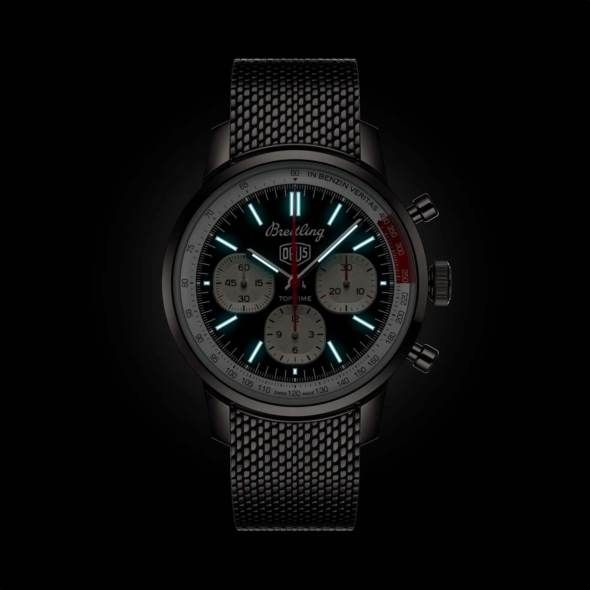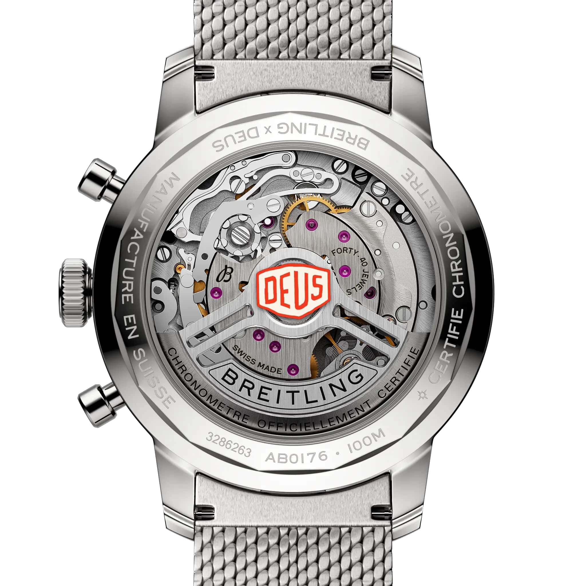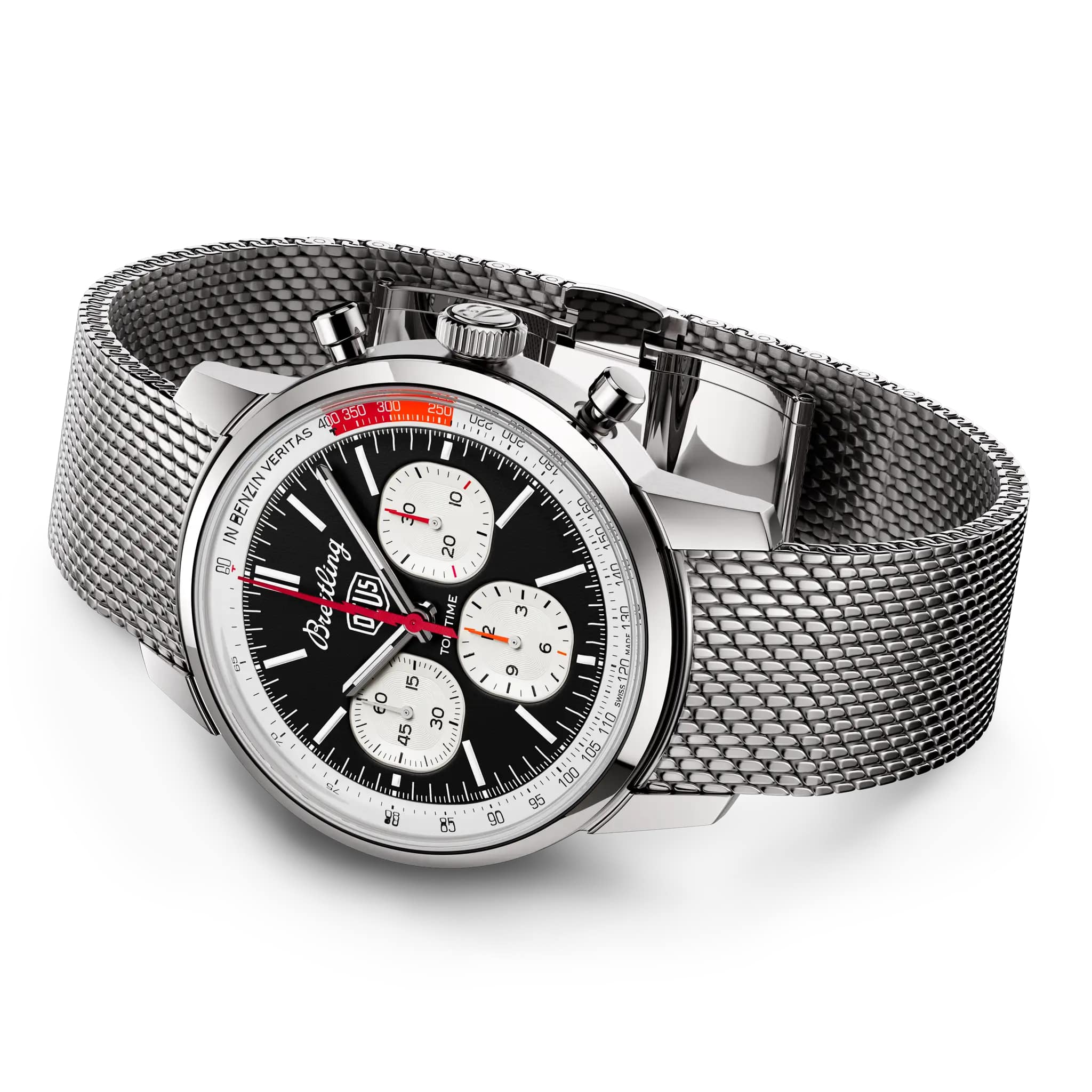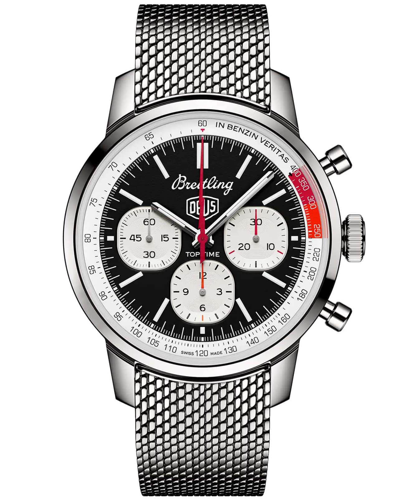 Мужские швейцарские часы-хронографХронографФункция позволяет измерять отрезки времени с особой точностью: часы, минуты, секунды. Верным признаком хронографа является наличие на циферблате 3 дополнительных окошек-счётчиков. с тахиметромТахиметрРазмеченная шкала, располагается на ободке или безеле часов. Тахиметр позволяет рассчитать скорость на определённом участке пути, расстояние измеряется в километрах или милях. Breitling Top Time B01 Deus AB01765A1B1A1, механический механизм (автоматический калибр) с высокой точностью. Сапфировое стеклоСапфировое стеклоПрочный и надёжный материал из кристалла сапфира синтетического происхождения, характеризующийся особой твёрдостью и устойчивостью к царапинам и повреждениям. устойчивое к появлению царапин, обладающее высокой прозрачностью. Корпус часов изготовлен из нержавеющей стали. Стальной браслет миланского плетения на раскладном замкеРаскладной замокДанный вариант застежки используется только на часах с металлическим браслетом. Отличительная особенность такого крепления в том, что длина браслета становится универсальной и вы можете самостоятельно отрегулировать нужный вам размер – застежка просто двигается по браслету часов.. Класс водозащиты: 100 метров, позволит плавать, нырять и заниматься другими водными видами спорта. Стрелки и метки с люминесцентным покрытиемЛюминесцентное покрытиеПозволяет считывать показания времени в темноте. Производители наносят на стрелки, часовые индексы, безель или поверхность циферблата светонакопительный состав, дающий холодное свечение..