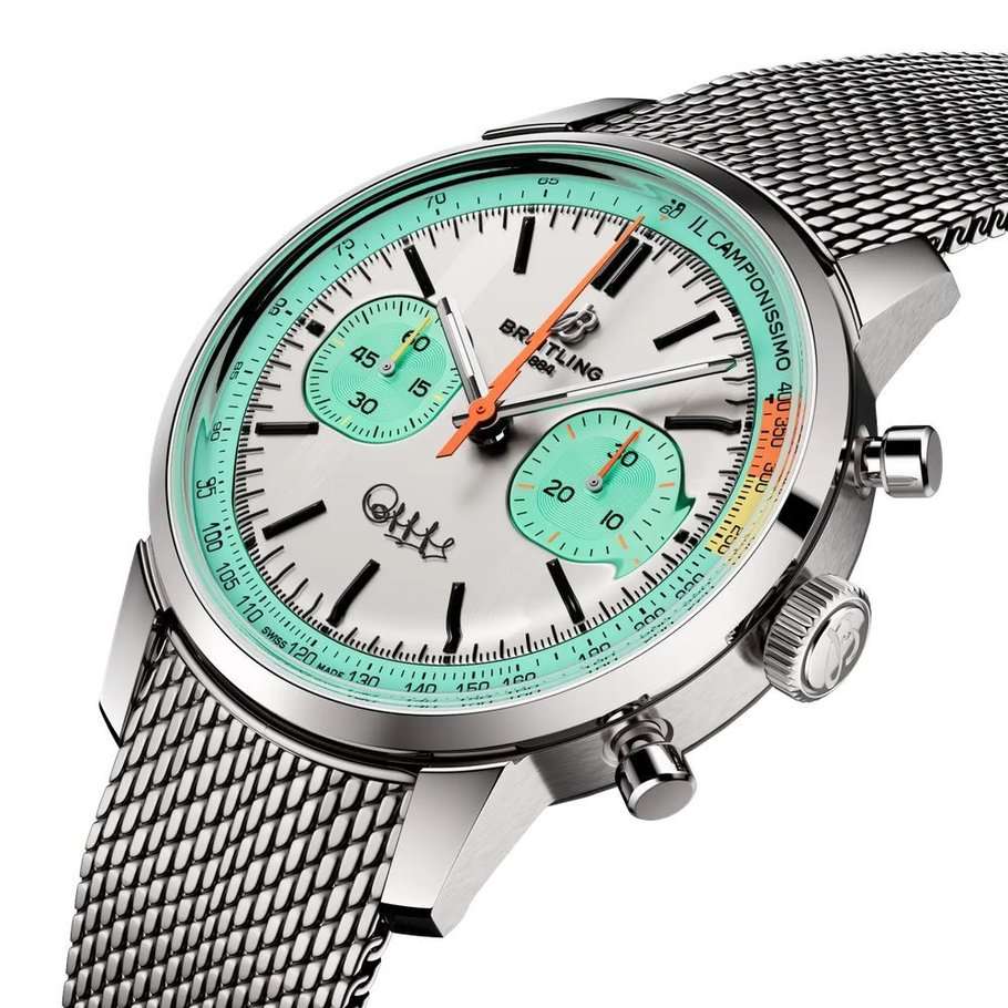 Breitling Top Time B01 Fausto Coppi AB01768A1A1A1 — лимитированные часы, вдохновлённые легендой велоспорта Фаусто Коппи и эстетикой ретро-хронографов 60-х годов. Корпус диаметром 41 мм выполнен из нержавеющей стали с комбинированной сатинированной и полированной отделкой. Прозрачная задняя крышка с гравировкой «Fausto Coppi Tribute» и «One of 750» подчёркивает уникальность выпуска. Циферблат защищён сапфировым стекломСапфировое стеклоПрочный и надёжный материал из кристалла сапфира синтетического происхождения, характеризующийся особой твёрдостью и устойчивостью к царапинам и повреждениям. с антибликовым покрытиемАнтибликовое покрытиеСлой оксида металла в 0,13-0,3 микрон, благодаря которому стекло часов не бликует и не отражает свет. Антибликовое покрытие уменьшает отражение света в 10 раз, обеспечивая отличную читаемость показателей циферблата.. Белый матовый циферблат украшен бирюзовыми субциферблатами и надписью «Il Campionissimo» по внешнему кругу. Подпись Fausto Coppi расположена на отметке 6 часов. Внутри установлен швейцарский автоматический калибр COSC-сертифицированныйСертификат COSCОфициальный сертификат, подтверждающий то, что часы ходят с особо высокой точностью. Для получения документа часы подвергаются тестовым испытаниям, разработанным швейцарским институтом тестирования хронометров COSC. Допустимая норма для механических часов -4/+6 секунд в день, для кварцевых моделей +/- 0,07 секунд в день. хронографХронографФункция позволяет измерять отрезки времени с особой точностью: часы, минуты, секунды. Верным признаком хронографа является наличие на циферблате 3 дополнительных окошек-счётчиков. Breitling B01, обеспечивающий точность, стабильность и запас хода до 70 часов. Модель укомплектована браслетом миланского плетения на застёжке «бабочка» с кнопкамиЗастёжка "бабочка"Такой вид застёжки дополняется предохранителями, помогающими избежать случайного раскрытия браслета. Обладают изящным исполнением. . Водонепроницаемость 100 метров делает часы надёжными не только в городе, но и в активной среде. Эта лимитированная модель — признание в любви к велоспорту и винтажной эстетике.