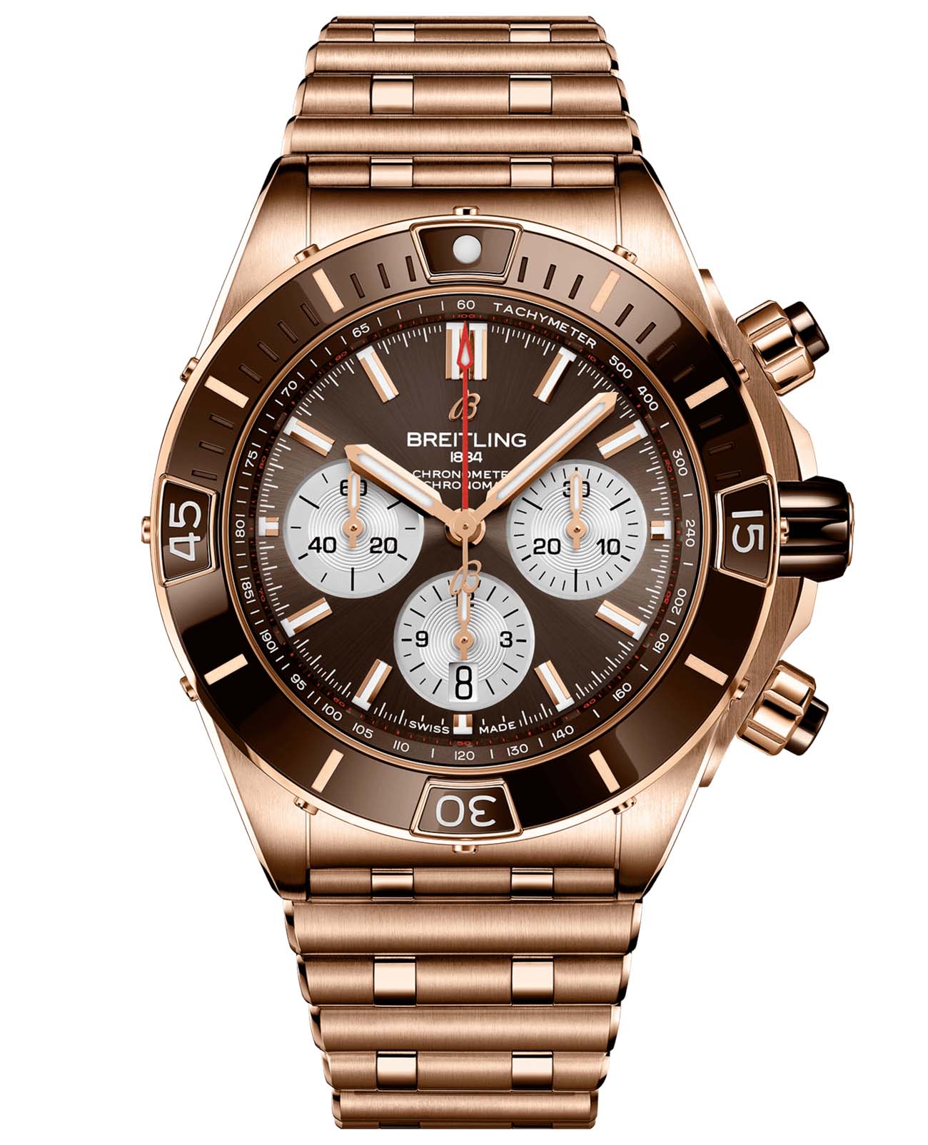 Мужские швейцарские часы с 18-каратным красным золотом Breitling Super Chronomat B01 44 RB0136E31Q1R1, механический механизм (автоматический калибр) с высокой точностью. Сапфировое стекло устойчивое к появлению царапин, обладающее высокой прозрачностью. Класс водозащиты: 200 метров, позволит плавать, нырять и заниматься другими водными видами спорта. Корпус часов изготовлен из золота, цвета.