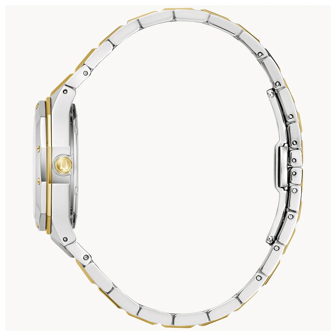 Женские кварцевые часы Bulova Prestige 98P234 – отражающий идеальное сочетание современного дизайна, надёжности и функциональности. Элегантный облик станет превосходным завершением образа, наделив его индивидуальным характером. Корпус из нержавеющей стали серебристого цвета, диаметром 32 мм идеально сбалансирован и элегантен. Сапфировое стеклоСапфировое стеклоПрочный и надёжный материал из кристалла сапфира синтетического происхождения, характеризующийся особой твёрдостью и устойчивостью к царапинам и повреждениям. защищает циферблат от царапин и устойчивое к механическим повреждениям. Неподвижный безельБезельВнешний ободок, закрепляющий стекло. В спортивных часах так называется поворотное кольцо с делениями на циферблате, выполняет роль таймера – замеряет отрезки времени на шкале. Неподвижный безель – элемент декора. Однонаправленно вращающийся безель на дайверских часах позволяет фиксировать моменты погружения и выныривания на поверхность. с частичным PVD-покрытиемPVDУльтратонкое покрытие наносится в технике вакуумного напыления, сочетает в себе нитрид титана особой прочности со слоем золота или оксида хрома. Несёт в себе декоративную или защитную функцию. золотистого цвета. Циферблат украшен бриллиантами. Стальной браслет с частичным PVD-покрытиемPVDУльтратонкое покрытие наносится в технике вакуумного напыления, сочетает в себе нитрид титана особой прочности со слоем золота или оксида хрома. Несёт в себе декоративную или защитную функцию. на застёжке-бабочке с кнопкамиЗастёжка "бабочка"Такой вид застёжки дополняется предохранителями, помогающими избежать случайного раскрытия браслета. Обладают изящным исполнением. обеспечивает комфортное ношение. Окошко даты находится в положении 3 часа. Стрелки с люминесцентным покрытиемЛюминесцентное покрытиеПозволяет считывать показания времени в темноте. Производители наносят на стрелки, часовые индексы, безель или поверхность циферблата светонакопительный состав, дающий холодное свечение.. Водозащита 100 метров, позволит плавать, нырять и заниматься другими водными видами спорта. Эта модель – отличный выбор для тех, кто ищет сочетание стиля, качества и функциональности. Часы станут не только полезным аксессуаром, но и выразительным элементом вашего имиджа.