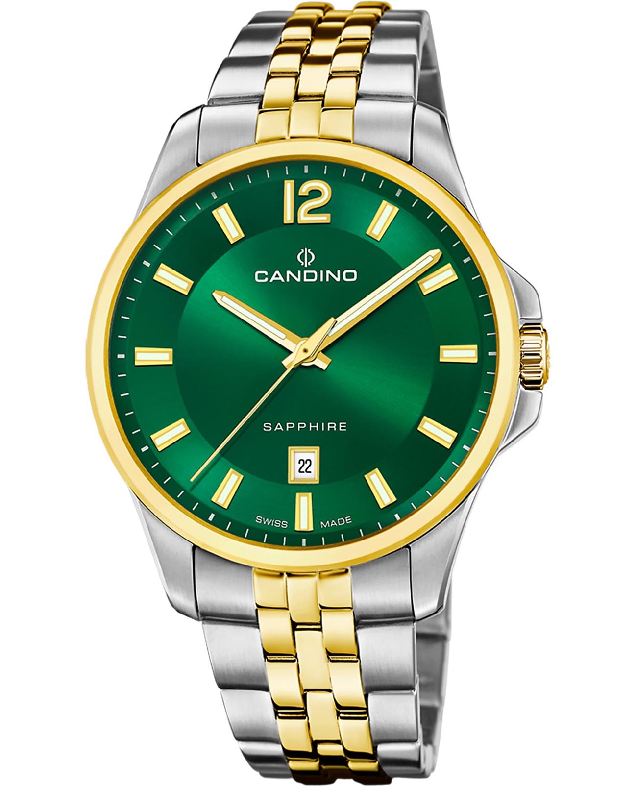 Мужские швейцарские часы с сапфировым стекломСапфировое стеклоПрочный и надёжный материал из кристалла сапфира синтетического происхождения, характеризующийся особой твёрдостью и устойчивостью к царапинам и повреждениям. Candino Gents Classic C4765/3, кварцевый механизм с высокой точностью. Класс водозащиты: 50 метров, позволит защитить корпус от случайных брызг или капель дождя. Корпус и браслет часов изготовлены из нержавеющей стали. Стальной браслет с частичным PVD-покрытиемPVDУльтратонкое покрытие наносится в технике вакуумного напыления, сочетает в себе нитрид титана особой прочности со слоем золота или оксида хрома. Несёт в себе декоративную или защитную функцию. на раскладной застёжкеРаскладная застёжкаТакой тип застёжки используется только на браслетах из металла. Она никогда не раскрывается полностью, происходит разделение на 2 и более частей. Раскладывающая застёжка снизит вероятность потери часов к минимуму.. Стрелки и метки с люминесцентным покрытиемЛюминесцентное покрытиеПозволяет считывать показания времени в темноте. Производители наносят на стрелки, часовые индексы, безель или поверхность циферблата светонакопительный состав, дающий холодное свечение.. Окошко даты находится в положении 6 часов. Класс водозащиты: 50 метров, позволит защитить корпус от случайных брызг или капель дождя.