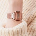 Уже известный 8-угольный ударопрочный корпусУдаропрочный корпусМеханизм заключён в корпус, выполненный из современных материалов, устойчивых к ударам, механическим повреждениям и падению с высоты: инновационный пластик, карбон, нержавеющая сталь, титан. выполнен из нержавеющей стали 316L, как и стильный браслет миланского плетения. Оригинально выглядит переливающаяся вставка, окружающая цифровое окошко. Кварцевый высокоточный механизм работает от батарейки, аккумулятор рассчитан на 3 года эксплуатации. Светодиодная подсветкаСветодиодная подсветкаСветодиодная или LED-подсветка обеспечивает появление яркого холодного свечения за счёт LED-элементов - маленьких лампочек. Они потребляют минимальное количество энергии, чаще всего можно встретить 1 светодиод, в нижней части циферблата. дисплея. Долговечное IP-покрытиеIP-покрытиеМетод ионного напыления. Демонстрирует повышенную устойчивость к истиранию, окислению и химическим веществам. Под воздействием высокого давления и температуры около 1500°C молекулы металла надёжно соединяются с частицами корпуса часов. цвета розового золота. Минеральное стекло устойчиво к появлению царапин. Автоматический календарь, будильник, секундомер. Габариты: 38 x 39,6 x 7,3 мм.