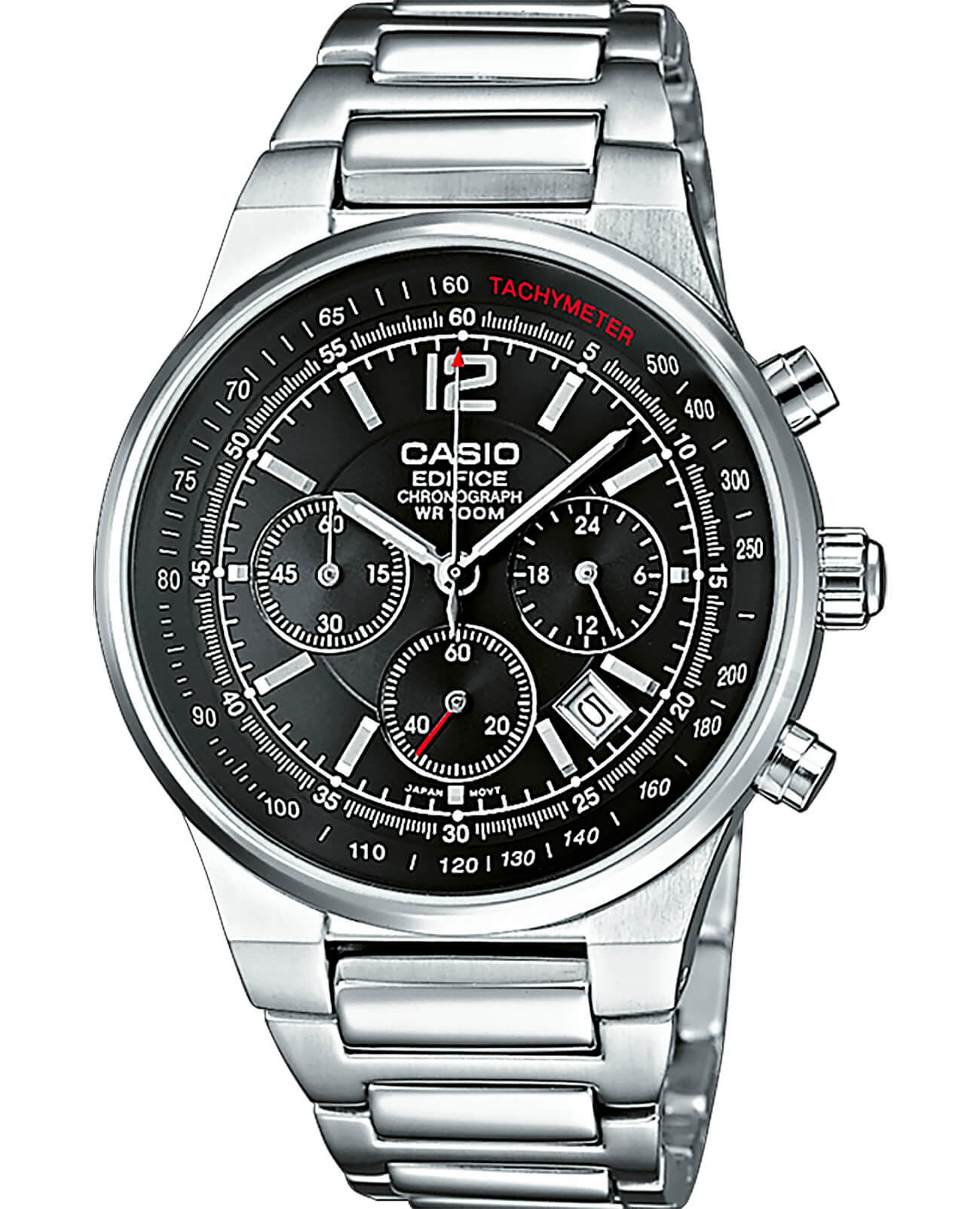 Лаконичный чёрный циферблат с тахиметрической шкалойТахиметрРазмеченная шкала, располагается на ободке или безеле часов. Тахиметр позволяет рассчитать скорость на определённом участке пути, расстояние измеряется в километрах или милях. и отдельными мини-счётчиками идеально подойдёт для дополнения повседневного образа. Стальной ударопрочный корпусУдаропрочный корпусМеханизм заключён в корпус, выполненный из современных материалов, устойчивых к ударам, механическим повреждениям и падению с высоты: инновационный пластик, карбон, нержавеющая сталь, титан. защищает кварцевый механизм от повреждений. Выпуклое минеральное стекло отличается устойчивостью к появлению царапин. Срок эксплуатации батарейки - 2 года. Люминесцентная подсветкаЛюминесцентное покрытиеПозволяет считывать показания времени в темноте. Производители наносят на стрелки, часовые индексы, безель или поверхность циферблата светонакопительный состав, дающий холодное свечение.. Секундомер, хронографХронографФункция позволяет измерять отрезки времени с особой точностью: часы, минуты, секунды. Верным признаком хронографа является наличие на циферблате 3 дополнительных окошек-счётчиков., календарь. Габариты: 39 x 47 x 12,5 мм.