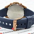 Модель сразу приковывает взгляды, брутальный насыщенно-синий циферблат с оригинальным узором отличается дизайном в автомобильной тематике, органично вписываются золотистые детали. Наручные часы отлично смотрятся со строгим костюмом или одеждой в casual-стиле. Спортивного характера добавляет ремешок из прочного полимерного материала. Точность хода кварцевого калибра составляет +/- 30 сек/мес, батарейка рассчитана на 3 года. Противоударный корпусУдаропрочный корпусМеханизм заключён в корпус, выполненный из современных материалов, устойчивых к ударам, механическим повреждениям и падению с высоты: инновационный пластик, карбон, нержавеющая сталь, титан. из хирургической стали 316L. Минеральное стекло противостоит царапинам. Сохранение водостойкости при давлении 10 бар. Люминесцентная подсветкаЛюминесцентное покрытиеПозволяет считывать показания времени в темноте. Производители наносят на стрелки, часовые индексы, безель или поверхность циферблата светонакопительный состав, дающий холодное свечение.. Габариты: 53,5 x 48,7 x 12,6 мм.