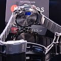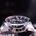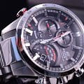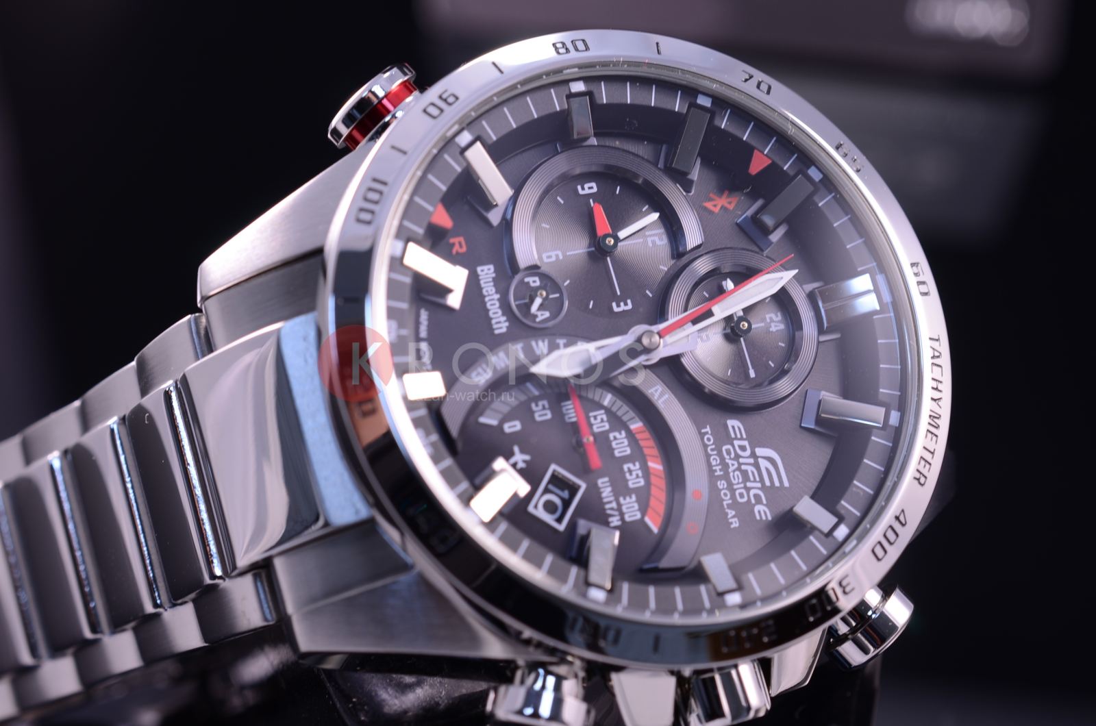 Общее исполнение аксессуара выдержано в автомобильной стилистике, тёмный циферблат отличается оригинальным расположением счётчиков. Наручные часы оснащены технологией BluetoothBluetoothСовременная технология, позволяющая синхронизировать часы с телефоном и переносить данные. Часы с Bluetooth расширяют возможности вашего смартфона и делают его использование ещё более удобным. с низким потреблением энергии, позволяющей часам считывать информацию с интернет-сервера точного времени и обеспечивать абсолютную точность времени. Питание происходит за счёт солнечной батареи - . Водонепроницаемость 100 метров. Минеральное стекло. Люминесцентная подсветкаЛюминесцентное покрытиеПозволяет считывать показания времени в темноте. Производители наносят на стрелки, часовые индексы, безель или поверхность циферблата светонакопительный состав, дающий холодное свечение.. Наличие авиарежима. Функции: уведомление о полученных сообщениях по электронной почте, поиск телефона, отображение числа и дня недели, секундомер, будильник, тахиметрТахиметрРазмеченная шкала, располагается на ободке или безеле часов. Тахиметр позволяет рассчитать скорость на определённом участке пути, расстояние измеряется в километрах или милях., расчёт средней скорости пройденного маршрута. Габариты: 52 x 48,1 x 14,2 мм.