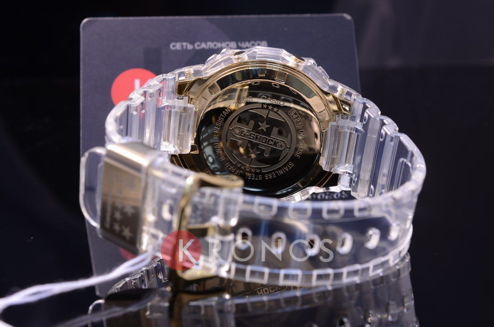 Лимитированная коллекция, под названием "Glacier Gold" - это настоящий подарок всем поклонникам G-Shock Модельный ряд был выпущен в честь 35-летия бренда G-Shock "Ледяное золото" - такое название получила коллекция благодаря изначальному ее концепту Во время работы дизайнеры опирались на образ ледяной глыбы, огромного куска льда, который выглядит мощно, красиво и завораживающе Таким образом подчеркивается невероятная надежность и "живучесть" часов даже в самых неблагоприятных и экстремальных условиях Корпус и циферблат изделия имеют золотистый цвет Часы покрыты особым полиуретаном (прозрачным)