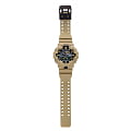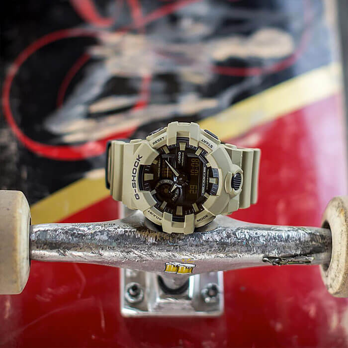 Аналого-цифровая модель в песочном исполнении идеально подойдёт для ношения в любой ситуации, гармонично смотрится контрастный циферблат с крупными элементами дизайна. Часы в стиле милитари из серии GA-700 обладают противоударным корпусомУдаропрочный корпусМеханизм заключён в корпус, выполненный из современных материалов, устойчивых к ударам, механическим повреждениям и падению с высоты: инновационный пластик, карбон, нержавеющая сталь, титан. из полимерного пластика, стойко переносящим любые механические повреждения. Батарейка рассчитана на 5 лет службы. Водонепроницаемость до 20 бар. Минеральное стекло устойчиво к появлению царапин. ЛюминесцентнаяЛюминесцентное покрытиеПозволяет считывать показания времени в темноте. Производители наносят на стрелки, часовые индексы, безель или поверхность циферблата светонакопительный состав, дающий холодное свечение. и светодиодная подсветкаСветодиодная подсветкаСветодиодная или LED-подсветка обеспечивает появление яркого холодного свечения за счёт LED-элементов - маленьких лампочек. Они потребляют минимальное количество энергии, чаще всего можно встретить 1 светодиод, в нижней части циферблата.. Дополнительные возможности: функция перемещения стрелок, включение и выключение звука кнопок, секундомер, мировое времяМировое время Полезное часовое усложнение, отображающее время в основных городах и известных областях по всему миру, оно связано с часовыми поясами, удобно для путешественников и бизнесменов. , таймер с автоповтором, UTCUTCВсемирное кординационное время, не имеющее привязки к географическому положению Гринвича, основывается на атомном отсчёте времени. Регулировка времени осуществляется более точно, чем устаревшее GMT.