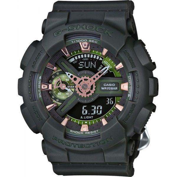 Стильные женские японские наручные часы. Корпус и браслет часов сделаны из полимерного пластика темно-зеленого цвета. Минеральное стекло, устойчивое к появлению царапин. Часы GMA-S110CM-3A снабжены множеством дополнительных функций - секундомер, таймер обратного отсчета, календарь, полностью автоматическая подсветка с автоматической регулируемой автоматизацией. Ежечасный сигнал, повтор сигнала будильника, мировое время. Водонепроницаемость часов до 200 метров (возможны занятия дайвингом). Особый шарм часам придает 3D дизайн - углубленные, объемные индексы и стрелки золотого цвета.
