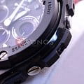 Брендовая модель серии G-Steel представлена в оригинальном исполнении, дизайнеры акцентировали внимание на внушительном безелеБезельВнешний ободок, закрепляющий стекло. В спортивных часах так называется поворотное кольцо с делениями на циферблате, выполняет роль таймера – замеряет отрезки времени на шкале. Неподвижный безель – элемент декора. Однонаправленно вращающийся безель на дайверских часах позволяет фиксировать моменты погружения и выныривания на поверхность. с IP-покрытиемIP-покрытиеМетод ионного напыления. Демонстрирует повышенную устойчивость к истиранию, окислению и химическим веществам. Под воздействием высокого давления и температуры около 1500°C молекулы металла надёжно соединяются с частицами корпуса часов.. Стильным дополнением стал красный каучуковый ремешок, обеспечивающий комфортное ношение. Это часы на солнечной батарее , позволяющие забыть о необходимости завода. Люминесцентная подсветкаЛюминесцентное покрытиеПозволяет считывать показания времени в темноте. Производители наносят на стрелки, часовые индексы, безель или поверхность циферблата светонакопительный состав, дающий холодное свечение. стрелок, яркая светодиодная подсветкаСветодиодная подсветкаСветодиодная или LED-подсветка обеспечивает появление яркого холодного свечения за счёт LED-элементов - маленьких лампочек. Они потребляют минимальное количество энергии, чаще всего можно встретить 1 светодиод, в нижней части циферблата. дисплея. Ударопрочный корпусУдаропрочный корпусМеханизм заключён в корпус, выполненный из современных материалов, устойчивых к ударам, механическим повреждениям и падению с высоты: инновационный пластик, карбон, нержавеющая сталь, титан. из пластика и хирургической стали 316L. Водостойкость 20 бар. Таймер, секундомер, будильник, мировое времяМировое время Полезное часовое усложнение, отображающее время в основных городах и известных областях по всему миру, оно связано с часовыми поясами, удобно для путешественников и бизнесменов. , автоматический календарь, приём радиосигнала для корректировки времени, хронографХронографФункция позволяет измерять отрезки времени с особой точностью: часы, минуты, секунды. Верным признаком хронографа является наличие на циферблате 3 дополнительных окошек-счётчиков.. Габариты: 55,9 x 49,3 x 15,3 мм.