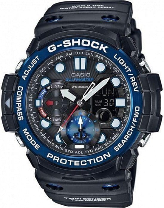 Противоударные мужские наручные часы в стильном исполнении из коллекции Gulfmaster. Кварцевые часы круглой формы с черным фоном циферблата. Корпус из пластика с минеральным стеклом прочно удерживается на руке пластиковым браслетом темного цвета. Часы Casio GN-1000B-1A снабжены множеством дополнительных функций - секундомер, таймер обратного отсчета, календарь, термометр, компас, кроме того в часах есть автоподсветка, ежечасный сигнал, повтор сигнала будильника, функция перемещения стрелок. Элемент питания в часах SR927W x 2