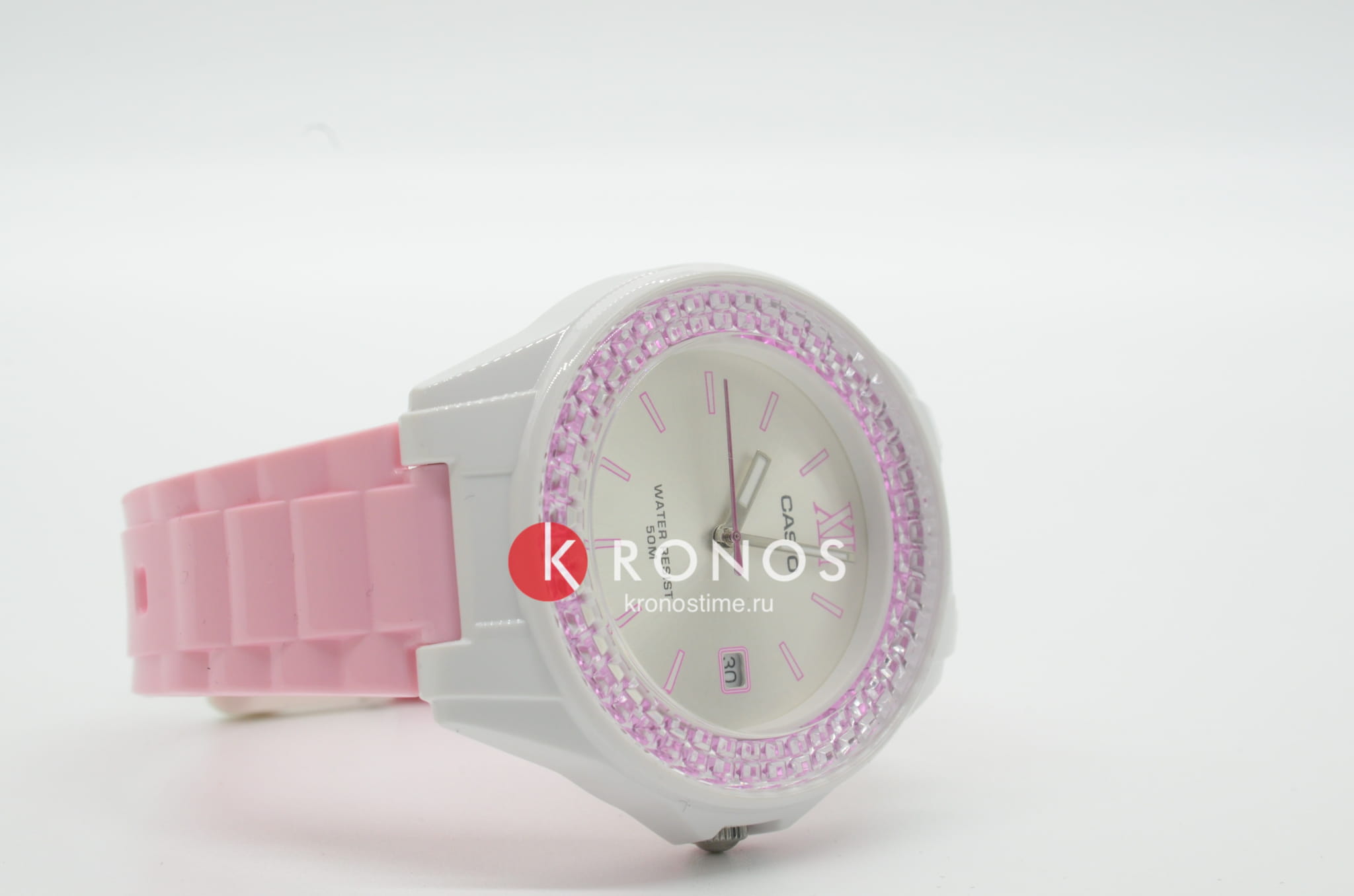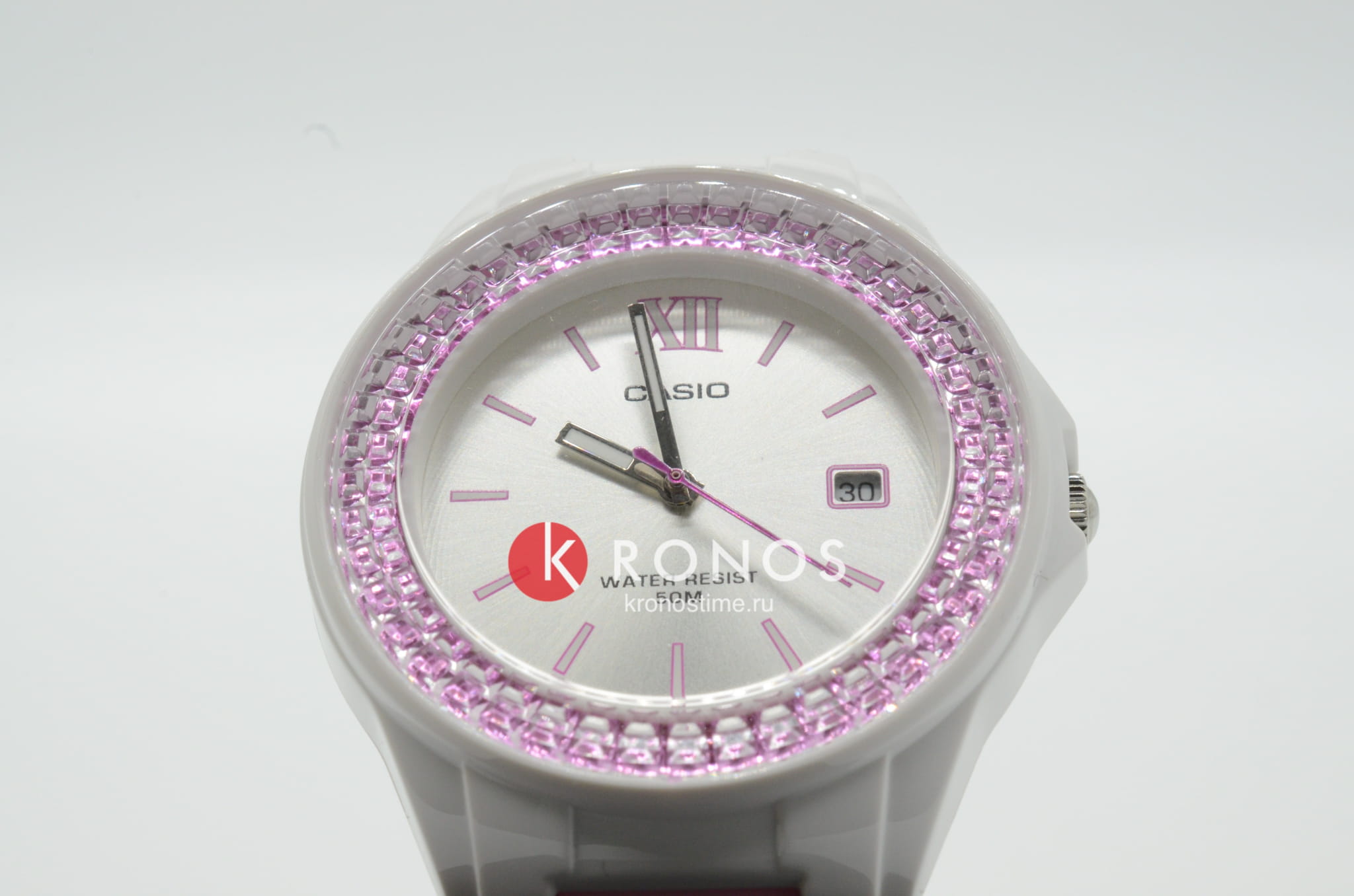 Корпус аккуратных и ярких наручных часов от Casio сделан из пластика. Яркий безельБезельВнешний ободок, закрепляющий стекло. В спортивных часах так называется поворотное кольцо с делениями на циферблате, выполняет роль таймера – замеряет отрезки времени на шкале. Неподвижный безель – элемент декора. Однонаправленно вращающийся безель на дайверских часах позволяет фиксировать моменты погружения и выныривания на поверхность. вокруг циферблата отражает падающий свет и добавляет аксессуару привлекательности. На круглом циферблате серебристого цвета расположены аккуратные римские цифры и штрихи. Благодаря кварцевому механизму отсутствует необходимость каждый раз заводить часы. Благодаря подсветке NeobriteПодсветка NeobriteИспользование светонакопительных составов на основе сульфида цинка или алюмината стронция, яркий свет можно наблюдать на протяжении 6-10 часов после «зарядки» часов около источника света. узнать информацию на циферблате легко даже в темное время суток. Водонепроницаемость составляет 50 WR.